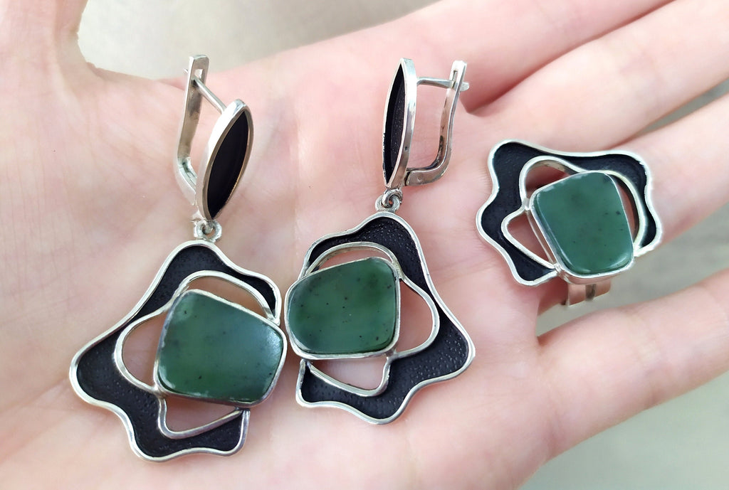 Upgrade your jewelry collection with our high-quality, sterling silver925 pieces from our Etsy shop. This set includes a beautiful a flower ring and dangle flower earrings, adorned with a green jade gemstone for a modern touch. Elevate your style with this unique, handcrafted jewelry.