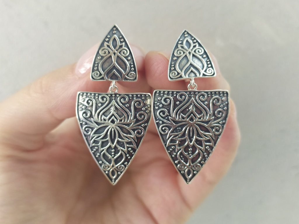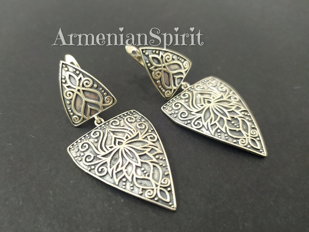 These long sterling silver 925 earrings feature a beautiful Armenian ornament and intricate pattern, adding a unique touch to any outfit. Crafted with quality materials, these earrings are a stylish and timeless addition to your jewelry collection. Discover the beauty of these long Sterling silver 925 earrings adorned with an intricate Armenian ornament. Shop now on our top-selling Armenian store and enjoy exclusive sales on this timeless piece. Enjoy a special discount now and add a unique touch to your jewelry collection.