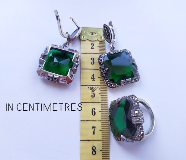 Introducing a luxurious and stunning Armenian jewelry set from the best store for gifts. Made with high-quality SILVER 925 and adorned with marcasite and a beautiful square green lab created stone, this set is perfect for any evening occasion. Experience the Armenian Spirit with this exquisite set of earrings and ring.