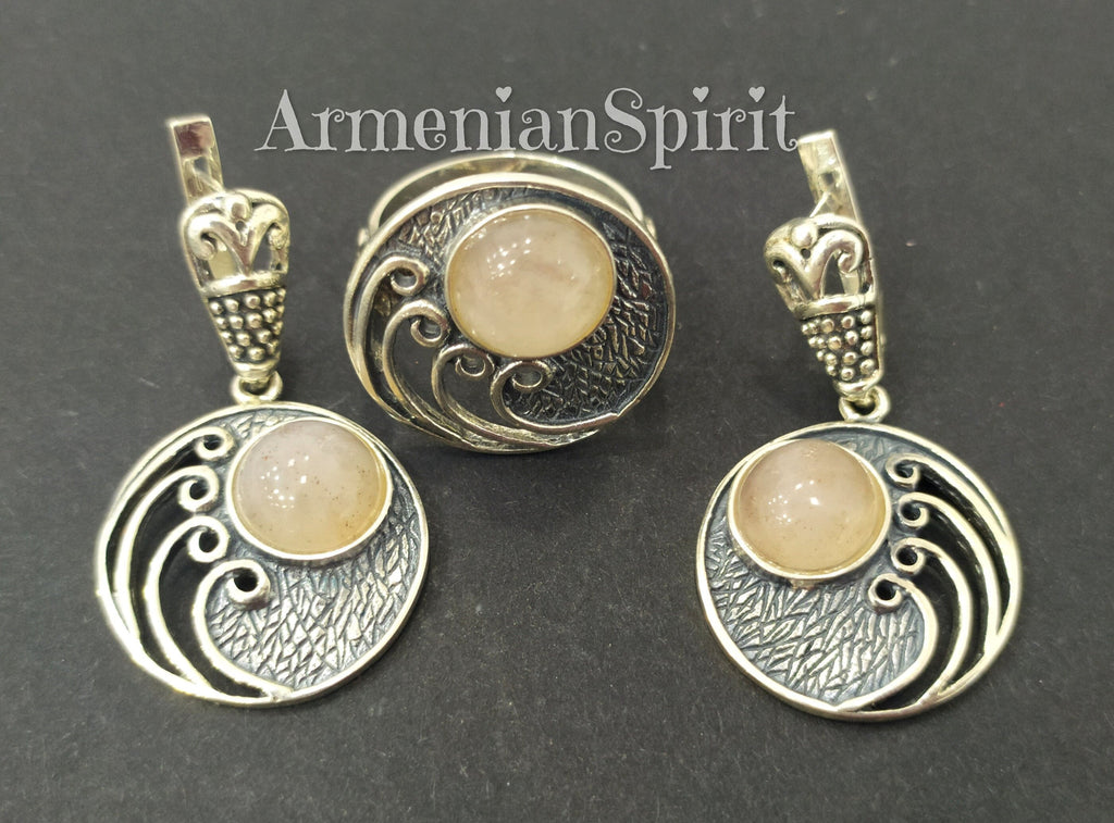 Enhance your style with this stunning jewelry set. Made of high-quality 925 stamped sterling silver and adorned with natural nude pink quartz, this Armenian jewelry from Armenian Spirit is a must-have for any fashion enthusiast. Elevate any outfit with this must-have set from one of the best jewelry stores.