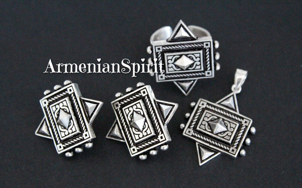 Add a unique touch to your style with our Armenian handmade jewelry set. Made from sterling silver, this set includes earrings, a ring, and a pendant that will create an interesting ethnic look. As one of online best sellers, this set is a must-have for anyone looking to elevate their fashion game. Featuring a unique geometric design and intricate patterns, this set will add a touch of elegance to any outfit. Stand out from the crowd and make a statement with this stunning set.