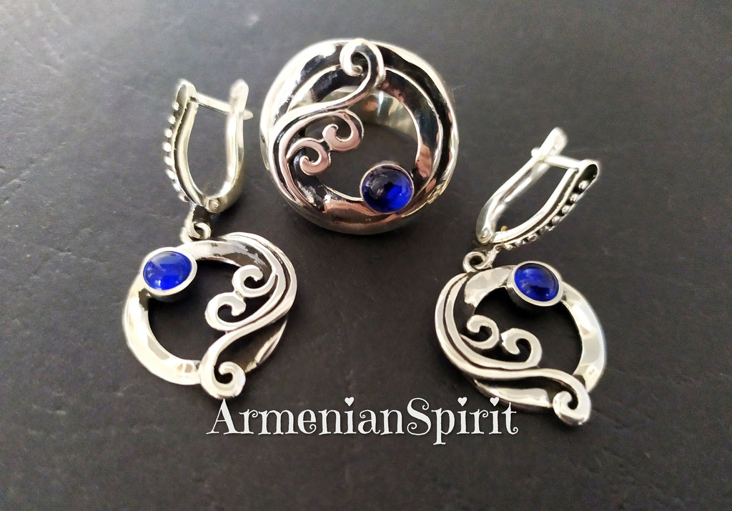 Find the perfect set of handmade jewelry on our Etsy shop. Crafted with high-quality sterling silver925, this unique designer set includes earrings and a ring featuring a stunning blue sapphire stone. Perfect for a boho or Victorian-inspired wedding, these Armenian jewels will add a touch of elegance to any outfit. Discover unique and beautiful jewelry on Etsy, the leading online store for gifts of the highest quality. With free shipping worldwide and discounts available, you can trust this reliable store for all your jewelry needs. Shop now and add some sparkle to your life.