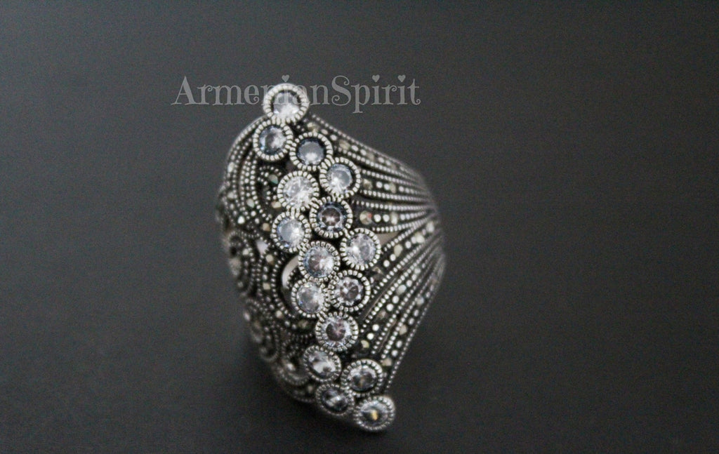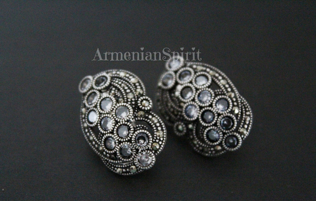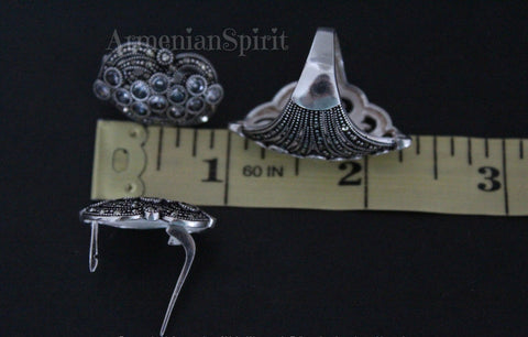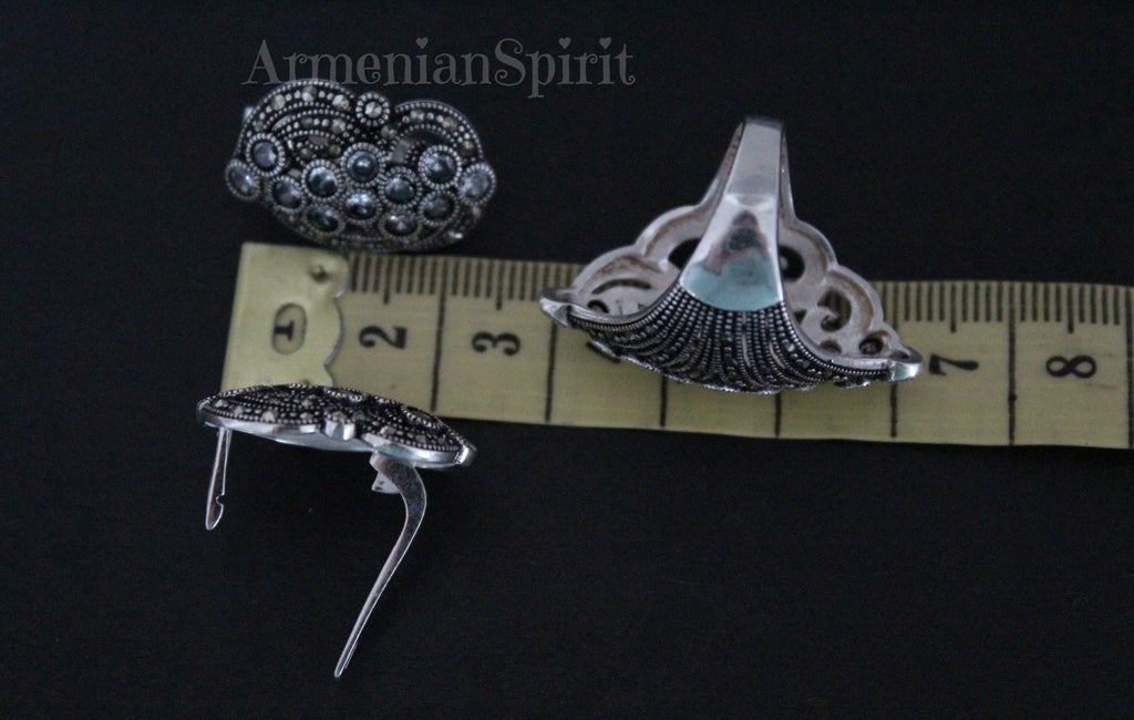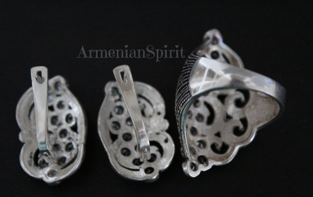 Indulge in luxury with our sterling silver 925 jewelry set. Crafted with high quality materials, this hypoallergenic set is perfect for those with sensitive skin. The intricate Armenian design, white zircon details, and vintage-inspired marcazite accents make this set a true heirloom piece. Elevate your style with our exclusive Victorian and medieval-inspired jewelry.