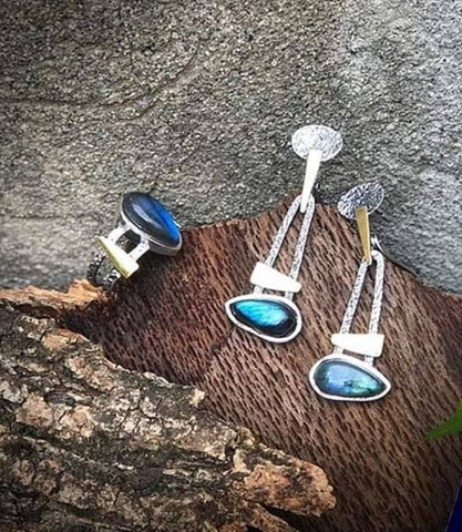 Elevate your jewelry collection with this stunning labradorite gemstone earring and ring set. Handmade in Armenia, each piece features silver 925 and gold plated accents for a uniquely beautiful design. Add a touch of elegance to any outfit with these unusual, handmade and contemporary jewels.