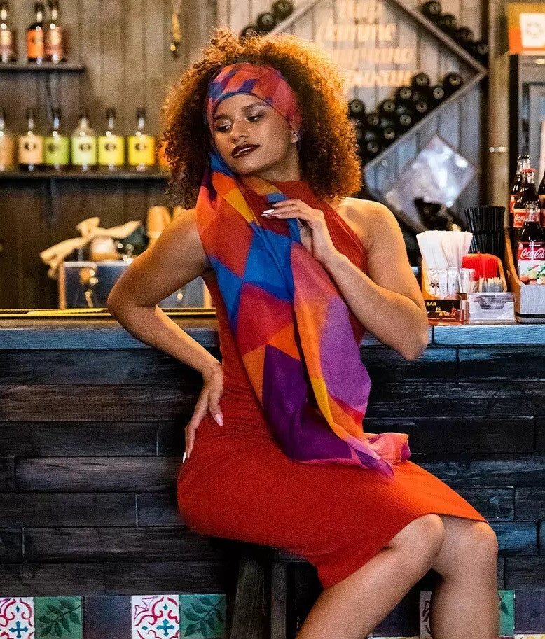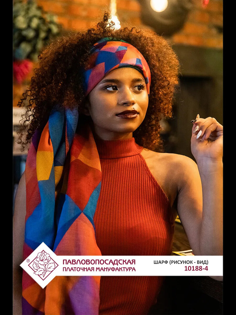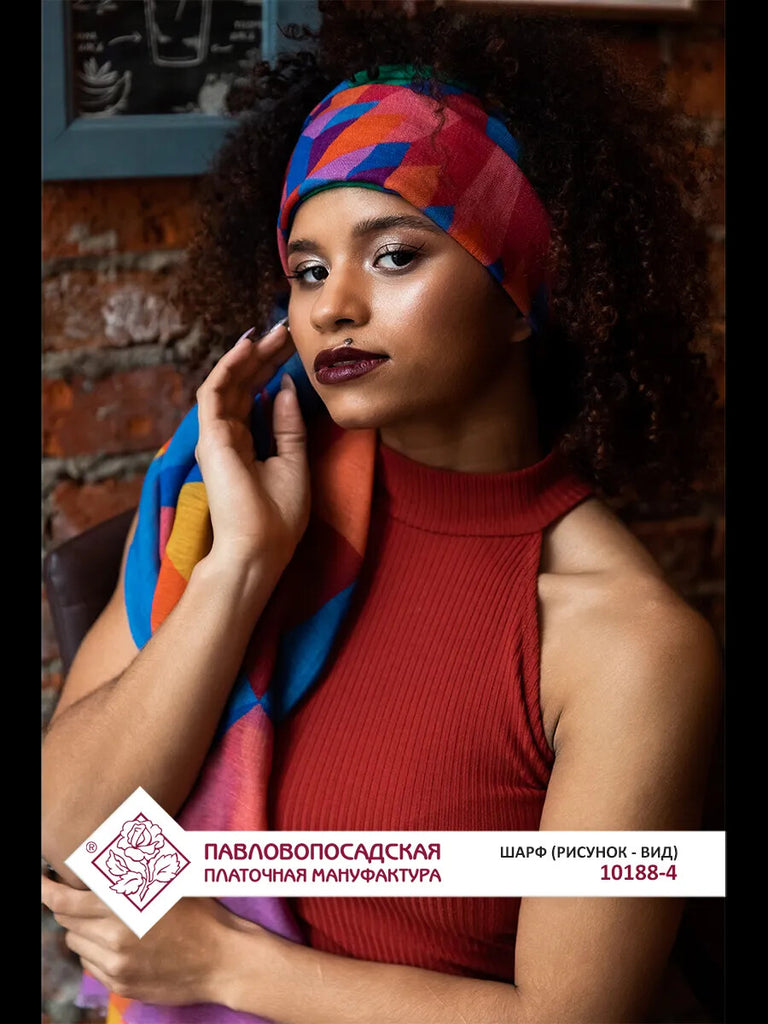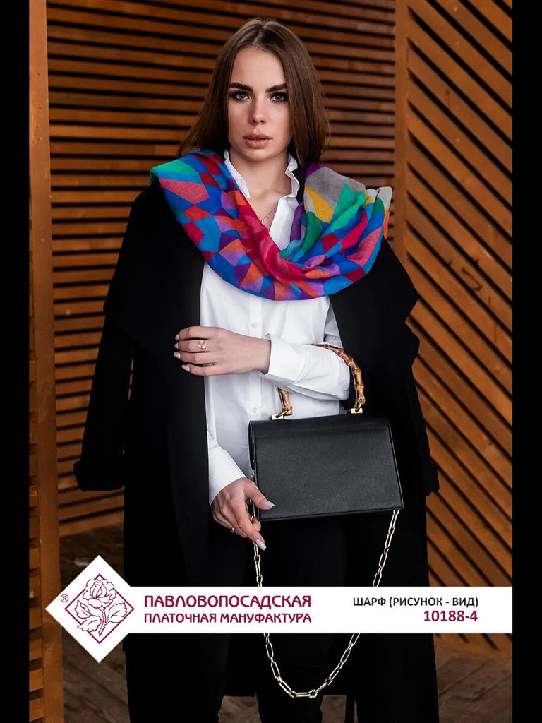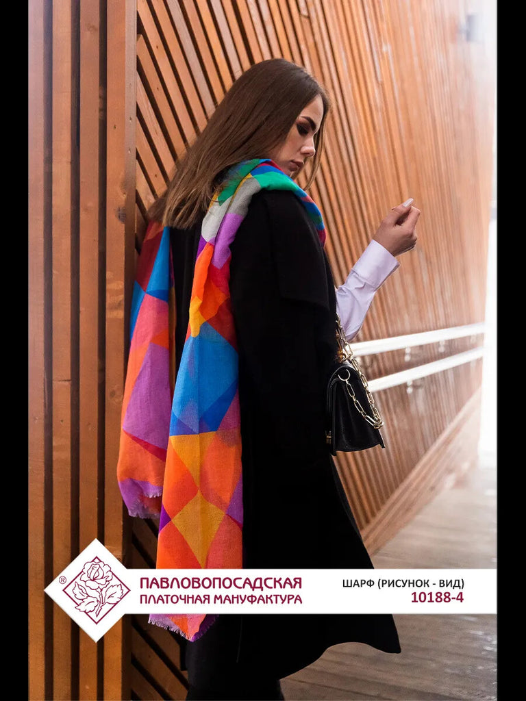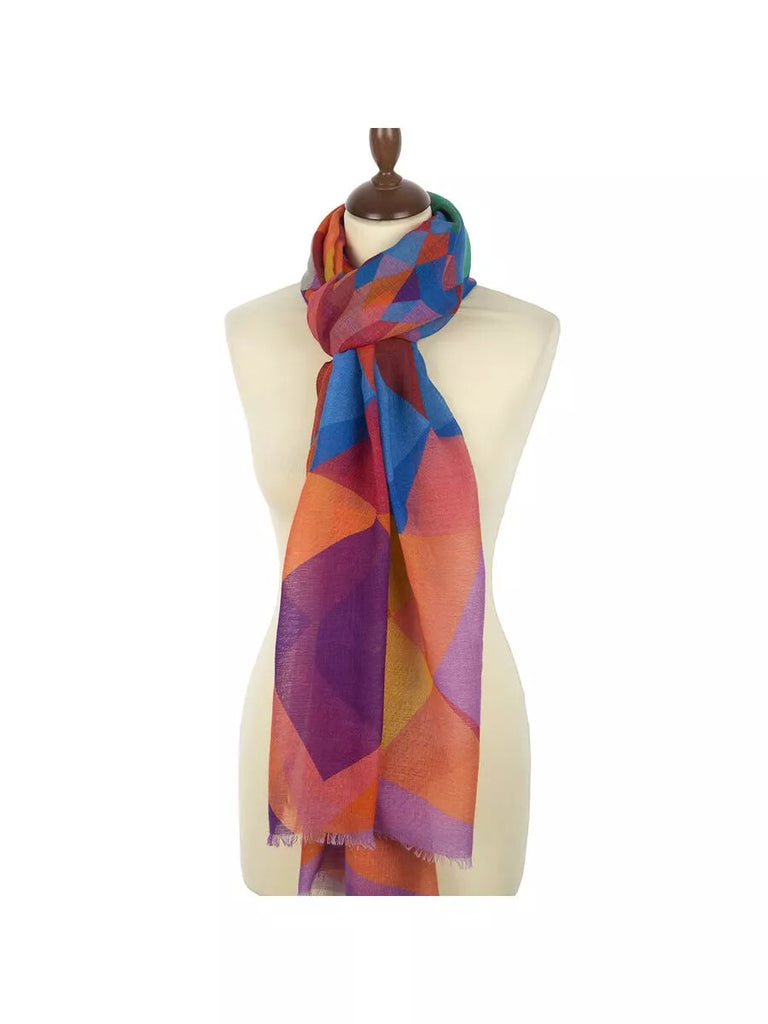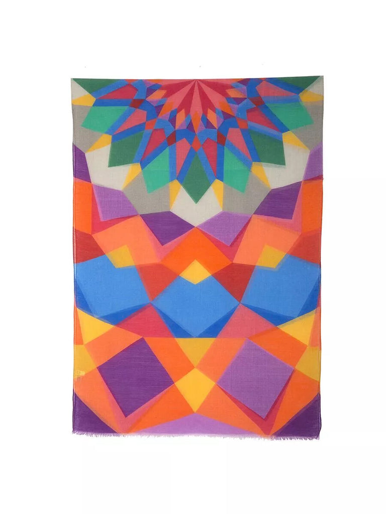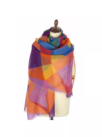Wrap yourself in bold color and cozy warmth with this stunning 100% wool scarf. Featuring a long, flowing design, it showcases a striking geometric pattern in a brilliant mix of orange, blue, pink, yellow, purple, and green. The bright hues and dynamic shapes make it a statement accessory, perfect for adding a pop of color to any outfit. Crafted from high-quality wool, it offers both softness and warmth, making it ideal for chilly days. Elevate your style with this eye-catching and artistic piece!