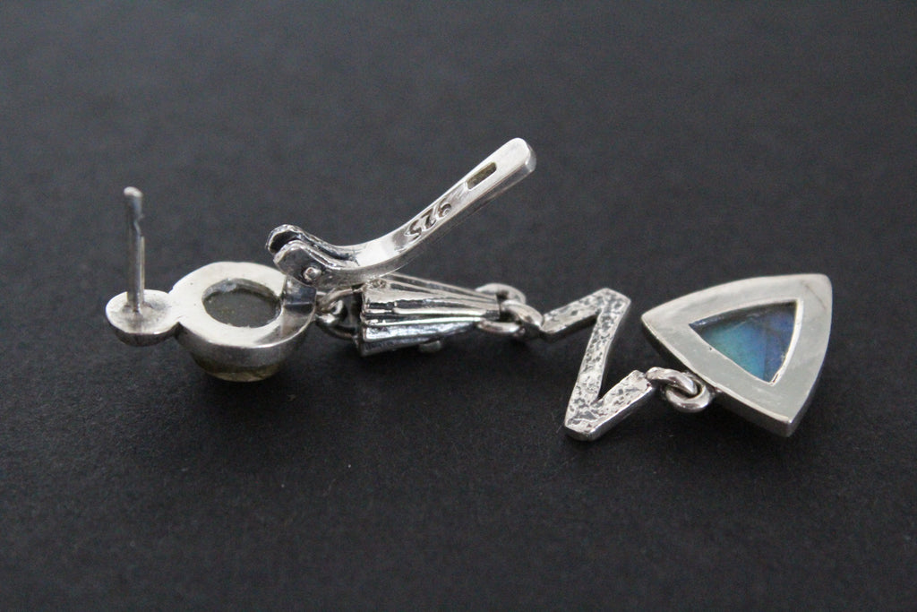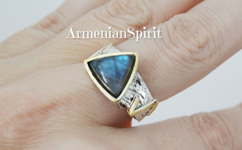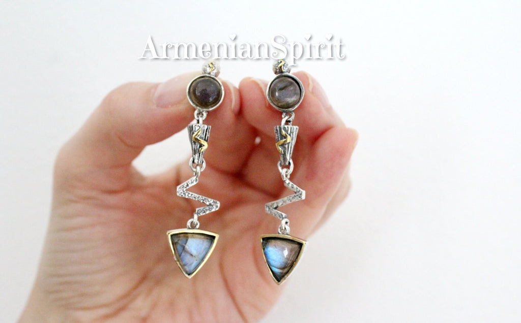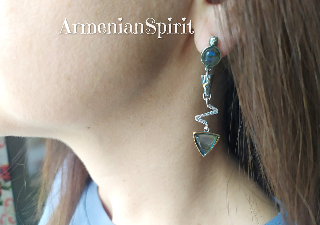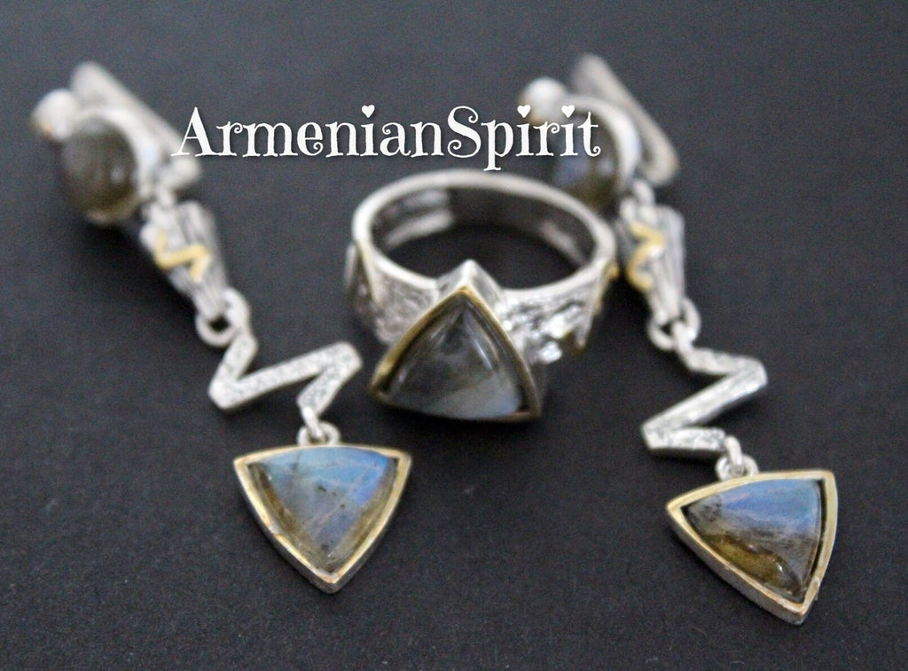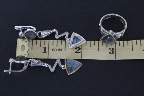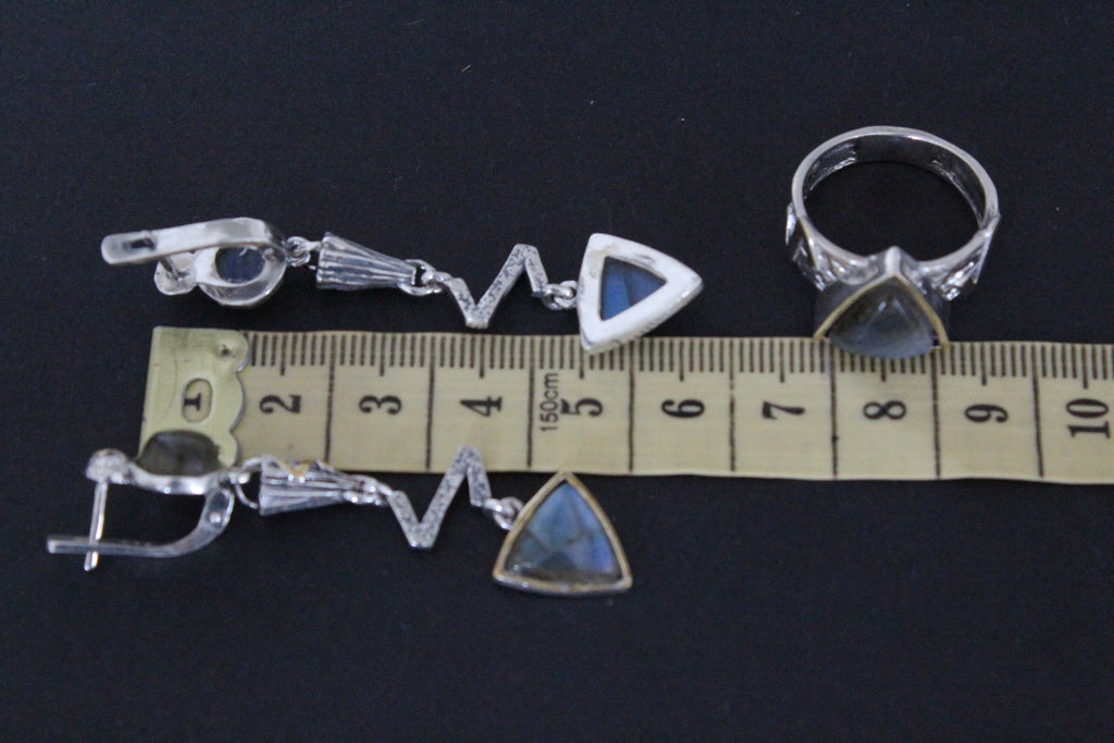 Enhance your style with our Long Earrings and Ring Set, made of Silver 925 and gold plated with labradorite blue gems. Elevate any outfit with this elegant and versatile jewelry that combines quality and fashion effortlessly. Perfect for any occasion, this set is a must-have for any jewelry lover. Discover the perfect gift for the stylish woman in your life with this modern and fashionable silver jewelry also from our store on ebay. Ideal for birthdays or anniversaries, it's a thoughtful and beautiful way to show your love. Shop now and make her day extra special.