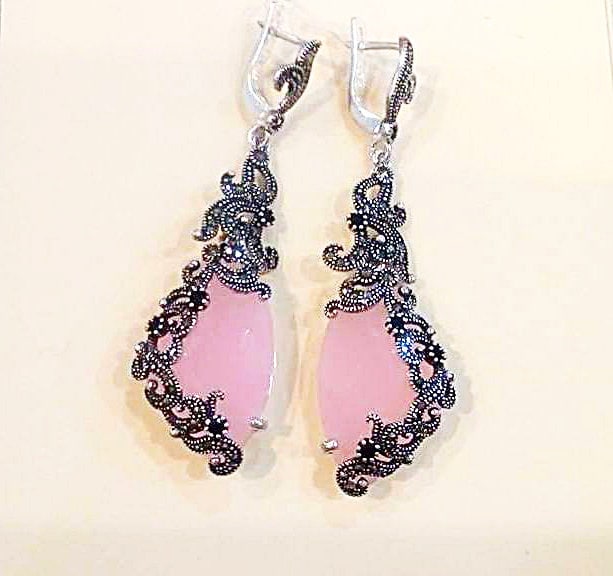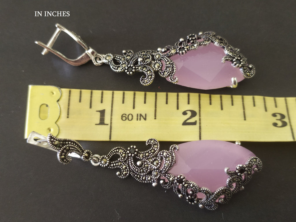 Upgrade your style with our luxurious Armenian Pink Quartz Marcasite EARRINGS. Made with STERLING SILVER and featuring a beautiful rose Tudor design, these Victorian-inspired pieces exude elegance and class. Perfectly complement your pink dress with these very long earrings, handcrafted for the best quality and luxury. Expertly crafted by Tudor Jewellery, these long earrings feature a stunning pink quartz rose, small black onyx stones and sparkly marcasite stones. Handmade with sterling silver 925, these Victorian Renaissance-inspired earrings are available in a variety of colors to match any outfit.