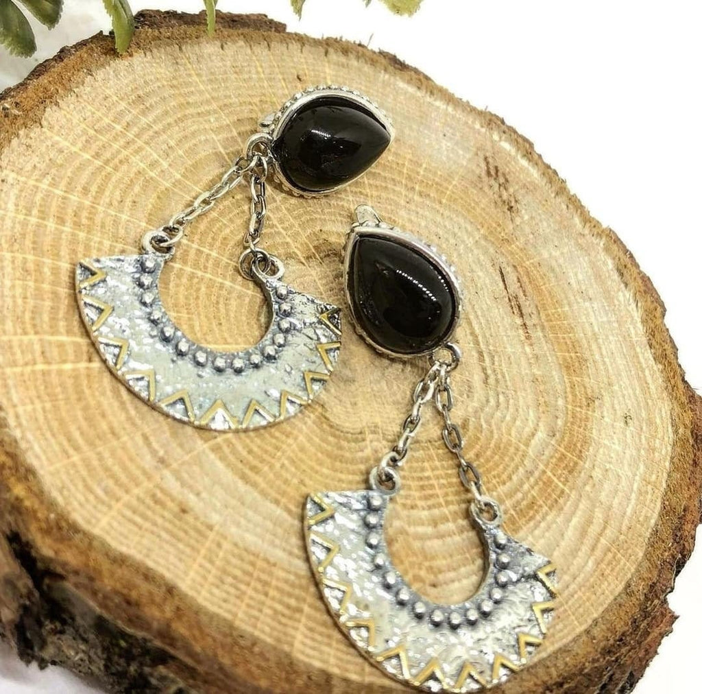 Upgrade your jewelry game with our high quality sterling silver925 large earrings from our Etsy shop. Featuring a unique crescent Aztec style with black onyx gemstones, gold plated accents, and an English lock for secure wear. Elevate any outfit with these stunning and eye-catching earrings. Looking for the best jewelry? Look no further than Etsy! Our top online store offers high-quality pieces that make perfect gifts. Plus, enjoy free shipping worldwide and great discounts. Trust in our reliable store for all your jewelry needs.