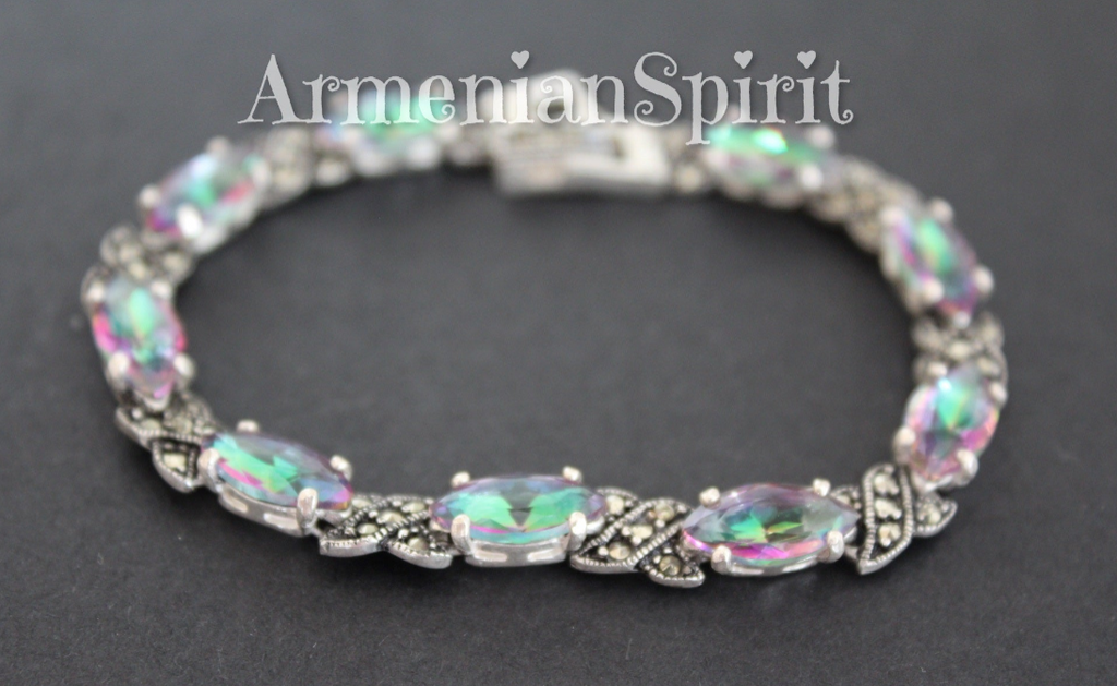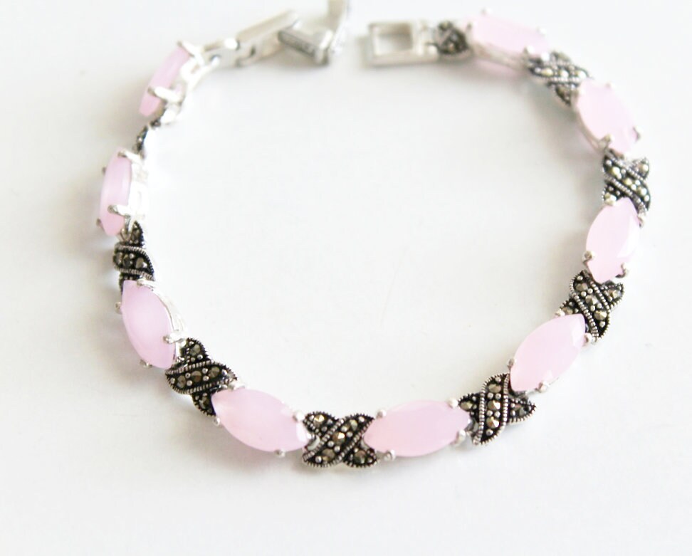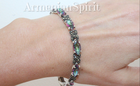 Enjoy discounts and free shipping on all orders from our Armenian Spirit shop! Introducing our elegant Marcasite bracelet, beautifully handcrafted with STERLING SILVER 925. The matte pink quartz adds a touch of sophistication to any outfit. Available in blue, green, red, white, and brown, this bracelet is the perfect statement piece for any occasion. Elevate your style with this delicate and timeless piece of Armenian jewelry.