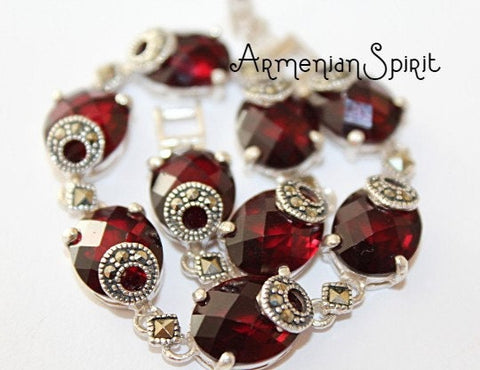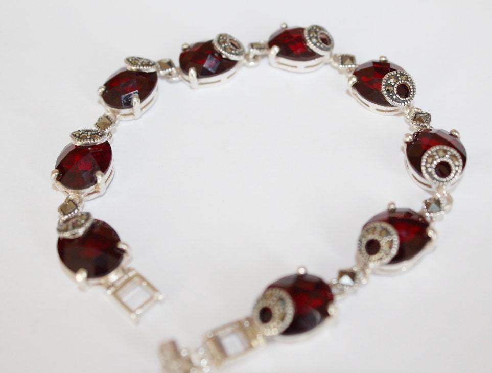 Add some sparkle to any outfit with our marcasite bracelet. Made with high quality 925 sterling silver, this tudor style jewelry features stunning wine red stones. Perfect for birthdays, anniversaries, or any special occasion. Shop now and buy the best in jewelry from our Etsy shop. Looking for the best jewelry online? Look no further than our top-rated store on Etsy! With high-quality pieces, free shipping worldwide, and frequent discounts, we're the go-to destination for all your gift needs. Shop with confidence and style, only at our reliable store.