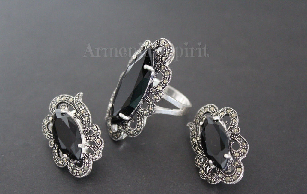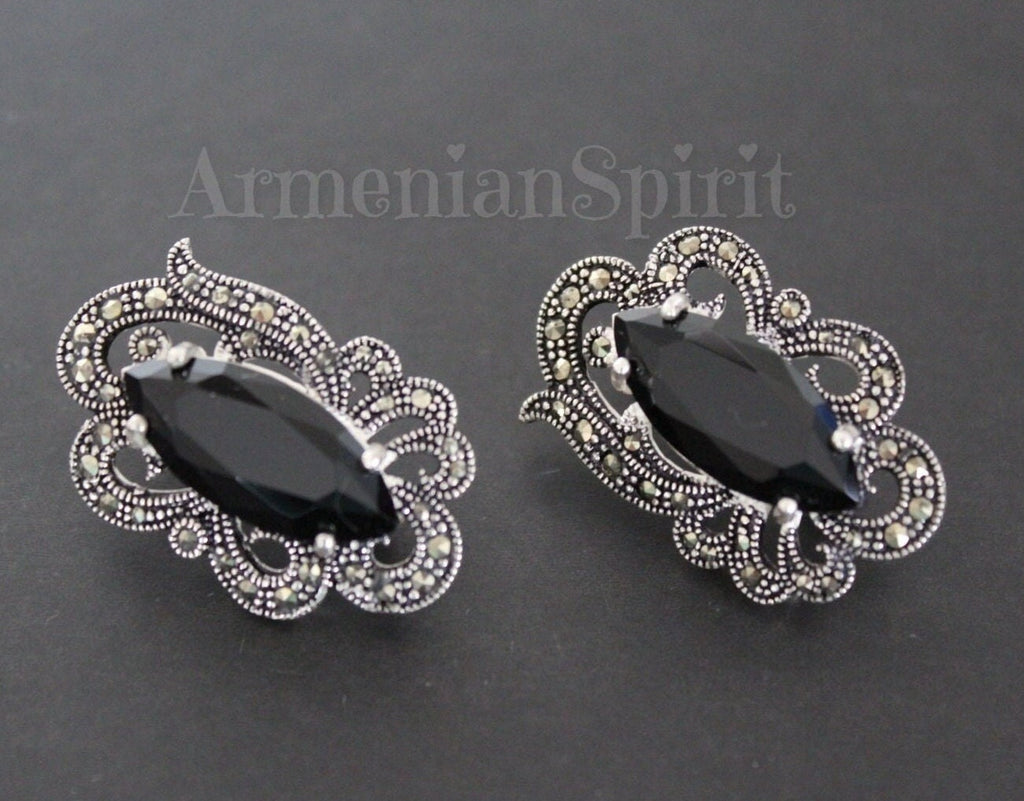 These marcasite earrings crafted from sterling silver 925 feature elegant black topaz stones, combining timeless style with durable quality. Their refined design adds a touch of sophistication to any outfit, making them a versatile accessory for everyday wear or special occasions. Comfortable and lightweight, they offer lasting beauty and support your unique style with confidence.