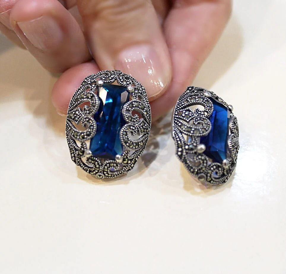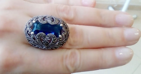 Indulge in the luxurious elegance of our High Quality Sterling Silver 925 Ring from Armenian Spirit. Crafted by renowned artisans, this dome-shaped ring features sparkling marcasites and a stunning electric blue topaz. The perfect complement to any electric blue outfit, this ring offers both style and sophistication. Love royal blue? This ring is a must-have.