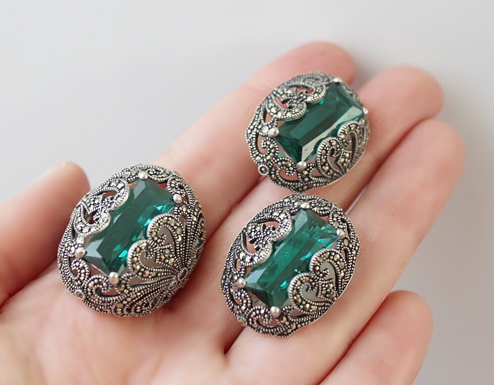 Elevate your evening dress with Marcasite SET Armenian jewelry, featuring a stunning emerald green stone in a dome design. Crafted with luxurious STERLING 925 silver, these accessories exude sophistication and love. Perfect for adding a touch of elegance to any formal occasion. An excellent choice for Etsy jewelry buyers looking for a hassle-free shopping experience. Indulge in luxury with our emerald green stone and shiny marcasite jewelry set. Perfect for elegant events and as a gift for a special woman. Crafted from premium sterling silver 925, elevate your style with these exquisite earrings and matching ring from the best Etsy shop.