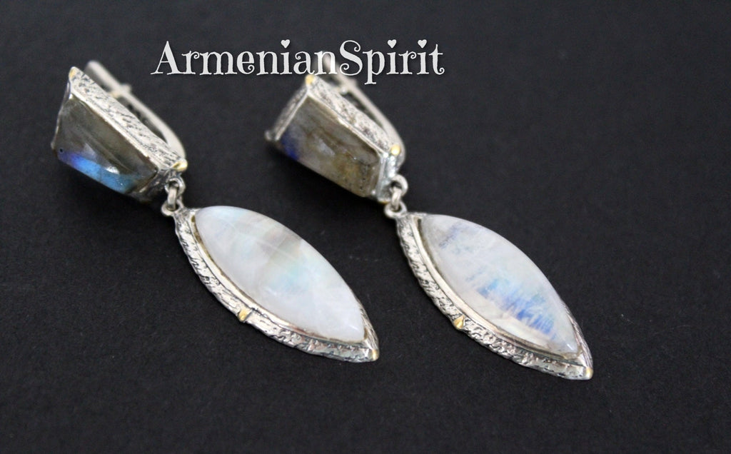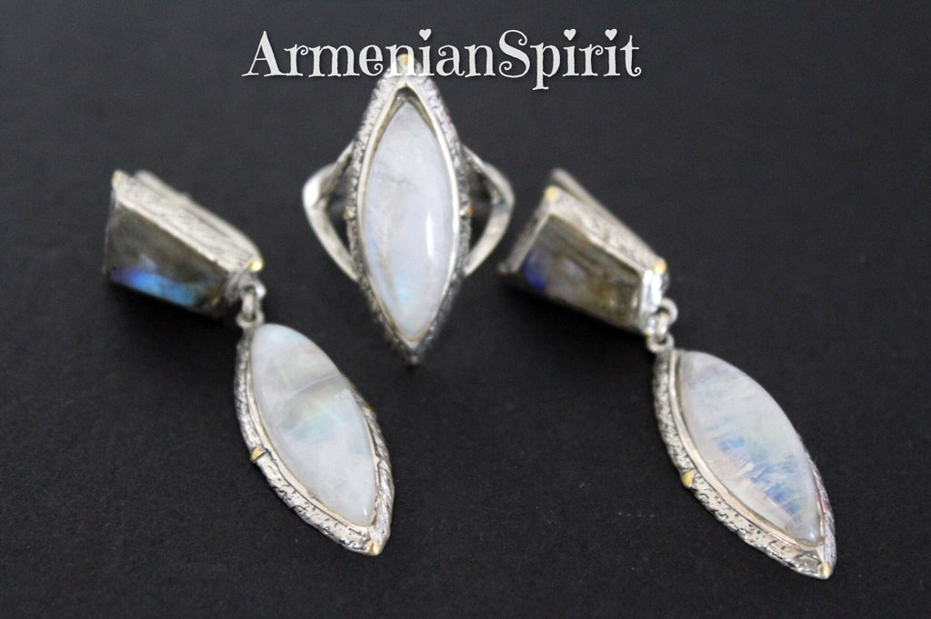 Experience the beauty of Armenian craftsmanship with our Moonstone and Labradorite earrings and ring made of high-quality Sterling Silver 925. Treat yourself or a loved one to a unique piece of jewelry from our top-rated Etsy store. Channel your inner Armenian spirit and elevate your style with our stunning collection. Best jewelry for sensitive skin. Hypoallergenic and perfect for gifting, this jewelry is wanted by everyone. Plus, enjoy free shipping worldwide from the top gift store!