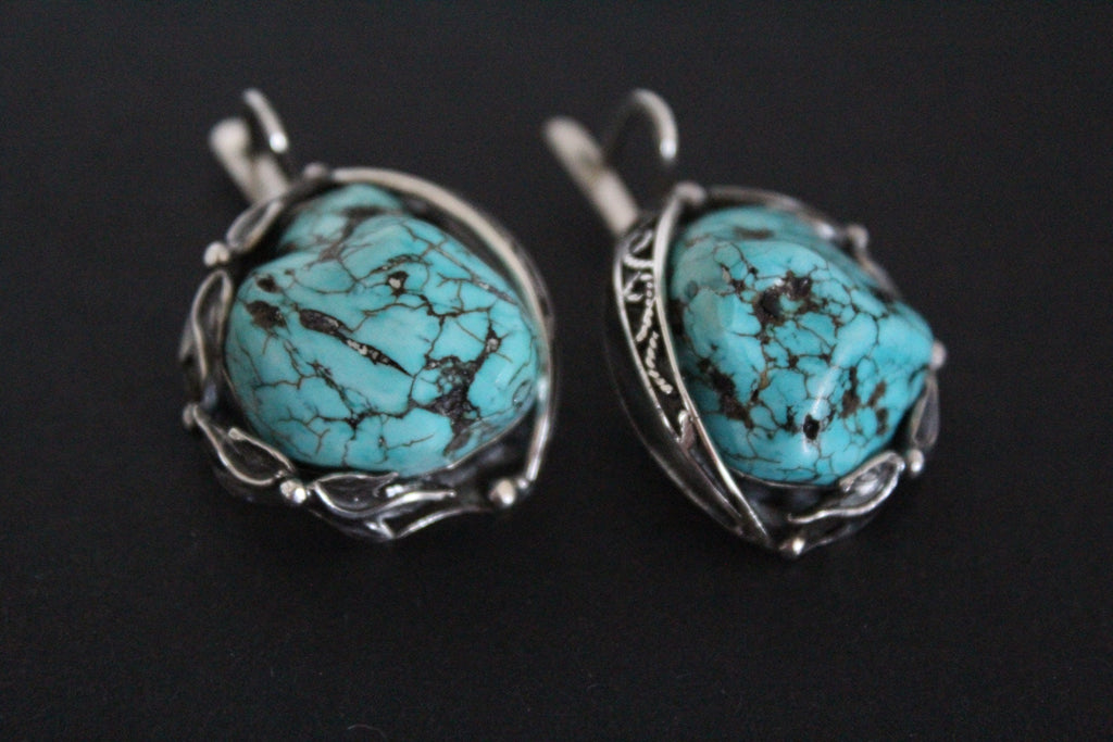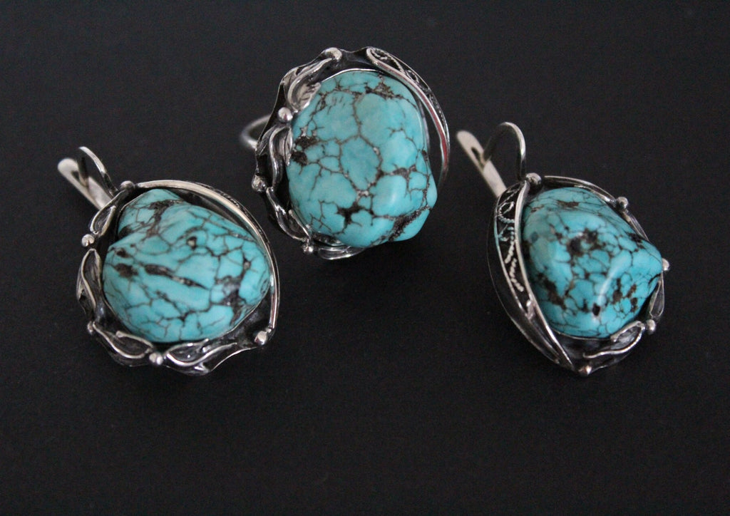 Indulge in the best silver jewelry on Armenian Spirit with this hand-crafted set. Made with natural turquoise and high-quality 925 silver, the adjustable ring and earrings offer both style and versatility for any woman. Elevate your look with this beautiful and timeless set.