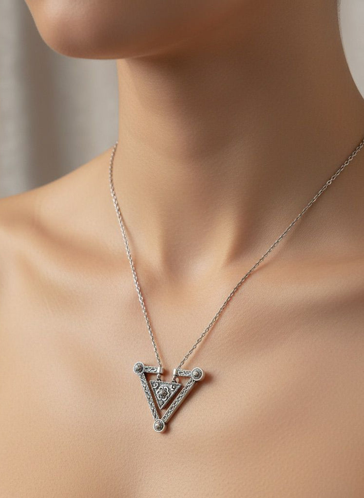 Elevate your everyday look with this striking sterling silver necklace, featuring a bold geometric triangle pendant that channels timeless Taraz design. Crafted from authentic 925 sterling silver, it's a versatile piece that pairs beautifully with both casual and dressed-up outfits. The clean lines and minimalist aesthetic make it a modern take on traditional Armenian artistry—perfect for those who appreciate understated elegance with a contemporary twist. A playful nod to heritage that works as hard as you do.