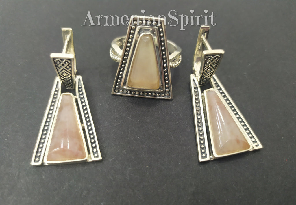 Introducing our NEW ARRIVAL Jewelry set from Armenian Spirit! Made with high quality Sterling silver 925 and natural nude pink quartz, this set includes earrings and a ring. Elevate your jewelry collection with these elegant and unique pieces, handcrafted with utmost care and attention to detail. Upgrade your style with Armenian jewelry today! Transform your style with Armenian Spirit's high quality jewelry set featuring a quartz love stone. Attract harmonious relationships and partners with this unique, handcrafted piece. Experience the true power of gemstones and elevate your personal energy.