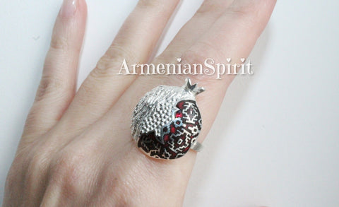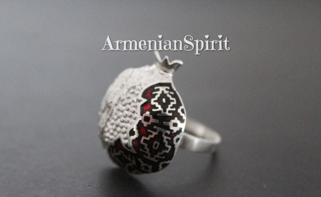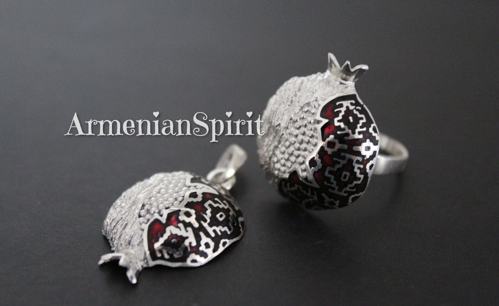 Add a touch of elegance and culture to your jewelry collection with our Pomegranate Armenian Taraz Ring and pendant. Made from high quality sterling silver925, this jewelry features intricate burgundy carpet ornament on the shape of a pomegranate. Add some sparkle to your life with Etsy's high-quality jewelry. Shop online for unique and beautiful gifts from our top-rated store. With free shipping worldwide and amazing discounts, we are your go-to destination for all your jewelry needs. Trustworthy and reliable, shop with confidence at Etsy.