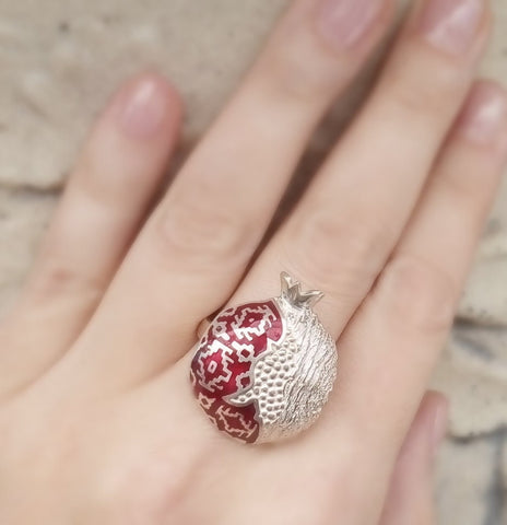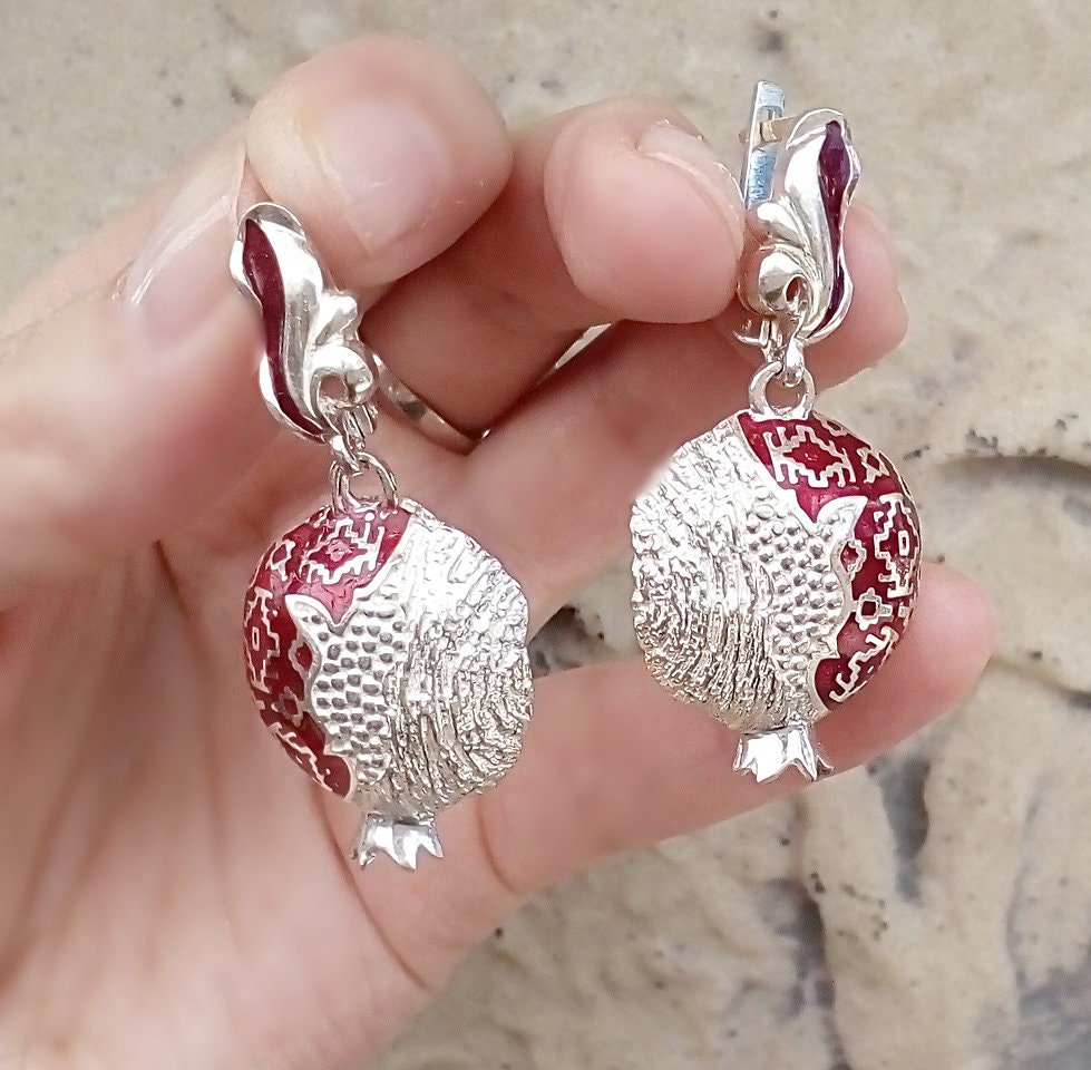 Invest in timeless Armenian tradition with our Persephone Pomegranate earrings. These stunning pieces are crafted with SILVER 925 and adorned with the intricate Armenian taraz ornament in burgundy. Make a statement and add a touch of elegance to any outfit with this unique purchase on Armenian Spirit.