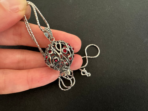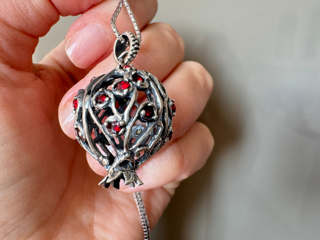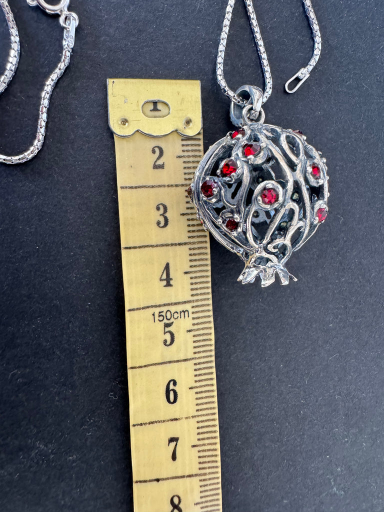 This Pomegranate Pendant is a beautiful fusion of femininity and modernity. Crafted from high-quality Silver 925, it features a unique herbal design and is adorned with vibrant red zircon stones. Perfect for adding a touch of sophistication to any outfit.