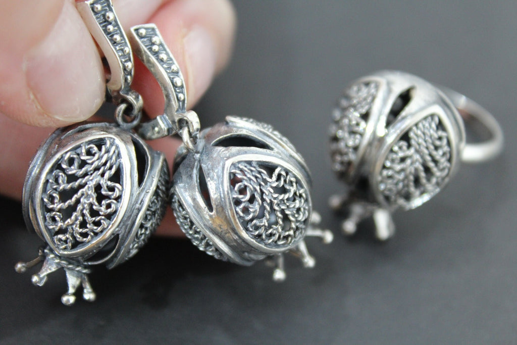 Indulge your beloved woman with our exquisite Pomegranate set earrings and ring. Handcrafted from Sterling silver 925, these intricate pieces feature filigree work inspired by the Persephone Goddess. A perfect gift for any occasion, sure to impress and delight. Show your appreciation for the special woman in your life with this unique Armenian handmade jewelry set.