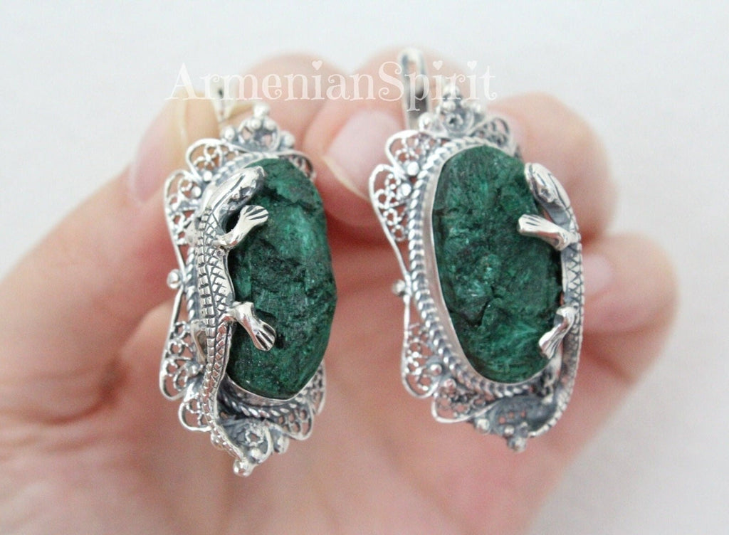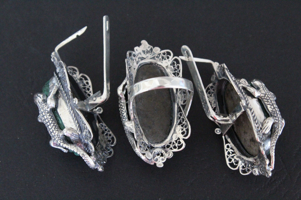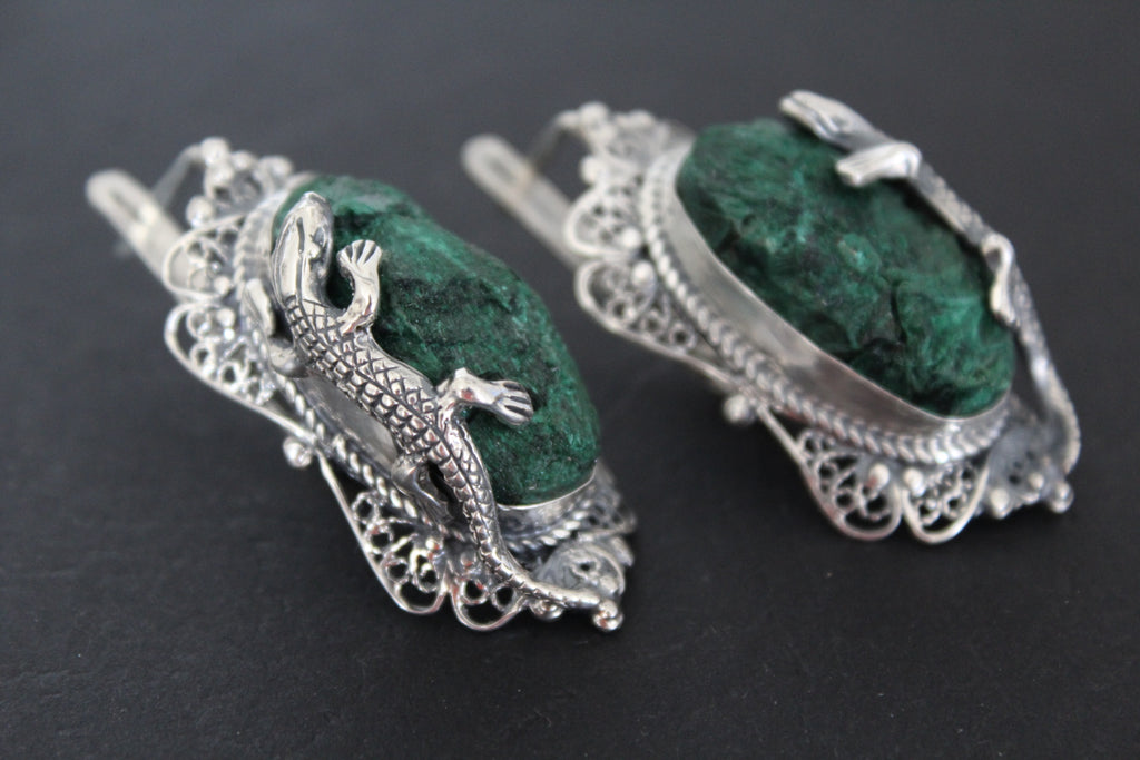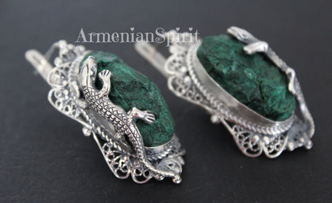 This RARE Jewelry SET features earrings crafted from Sterling silver 925 and adorned with velvet malachite gemstones in a beautiful green hue. Handmade by artisans in Armenia, these earrings also showcase a unique lizard salamander design, making them one-of-a-kind pieces. Elevate your style with this exquisite jewelry set. Upgrade your collection with confidence knowing you're getting 925 stamped high-quality pieces from an expert marketplace.