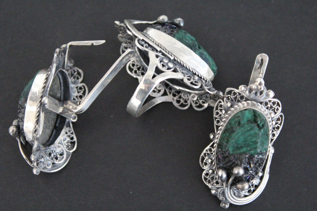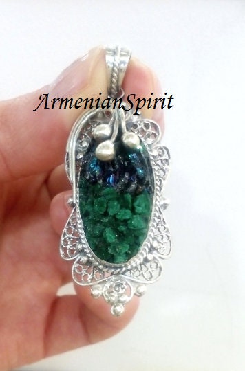 Real Malachite pendant Vintage style Armenian jewelry Tudor Big filigree STERLING SILVER 925