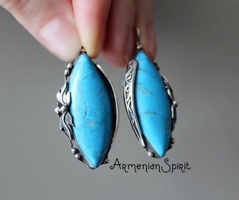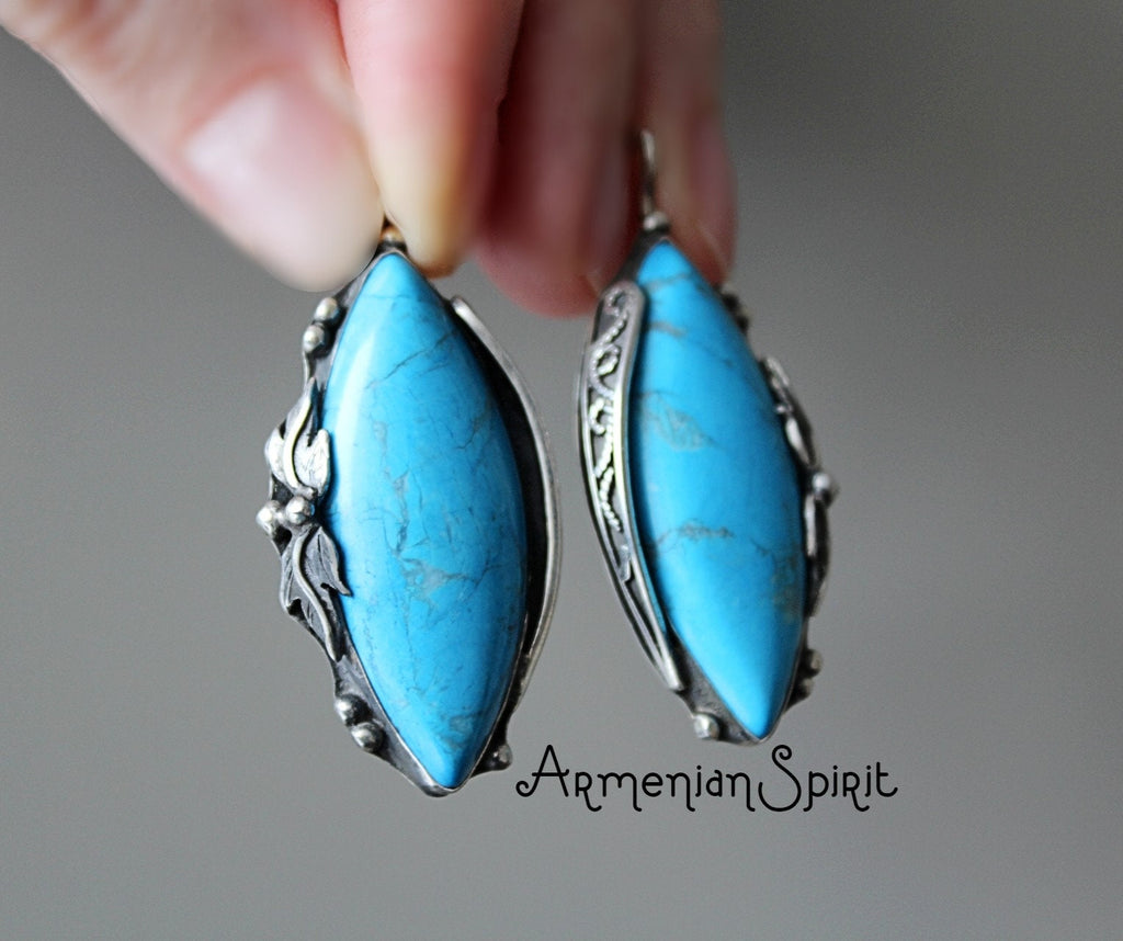 Elevate your style with these beautiful real turquoise earrings, handmade in Armenia. Each piece features a stunning, natural turquoise gemstone set in silver 925 and crafted with vintage charm. These light blue earrings are the perfect addition to any jewelry collection. Discover the perfect gift for the woman who loves exclusive and high quality jewelry. Our one-of-a-kind silver pieces from Armenian Spirit are sure to impress and add a touch of elegance to any outfit. Shop now and make her day with a unique piece that she'll cherish.
