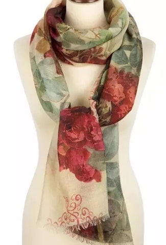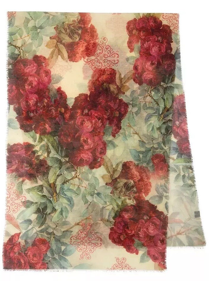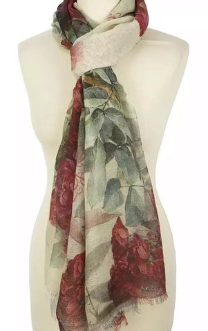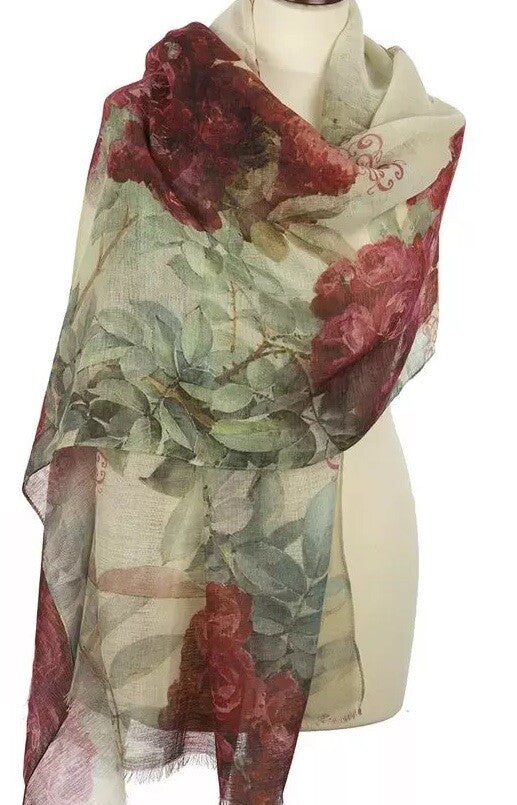 Meet your new favorite accessory! This vintage-inspired rectangular scarf is a playful wardrobe essential that transitions seamlessly through spring blooms, summer strolls, autumn adventures, and cozy winter days. Measuring a generous 31x90 inches and crafted from sumptuous 100% merino wool, it drapes beautifully while keeping you wonderfully warm. The enchanting burgundy floral pattern brings nostalgic charm and effortless sophistication to any ensemble. Whether you're tying it around your neck, wrapping it as a shawl, or styling it as a headscarf, this versatile piece adds personality and warmth to your look all year long.