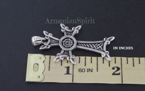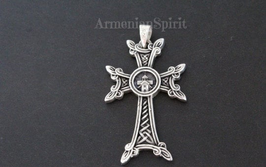 Cross reversible - arevakhach eternity sign from one side and church from other side. This beautiful big black cross is made of 925 sterling silver. The cross is made in the shape of an Armenian khachkar - a traditional Armenian cross. Any Armenian will be happy to receive such a gift. For any Armenian, this will be a welcome gift. Armenia was the first in the world to adopt Christianity and made Christianity their state religion. Therefore, the cross is a very significant gift. Such a cross is also suitable for Orthodox, Catholics and Baptists. A beautiful Armenian ornament adorns the cross. It looks a bit like a Celtic pattern. The cross is suitable for men and women. Usually crosses are bought as a gift for Epiphany.