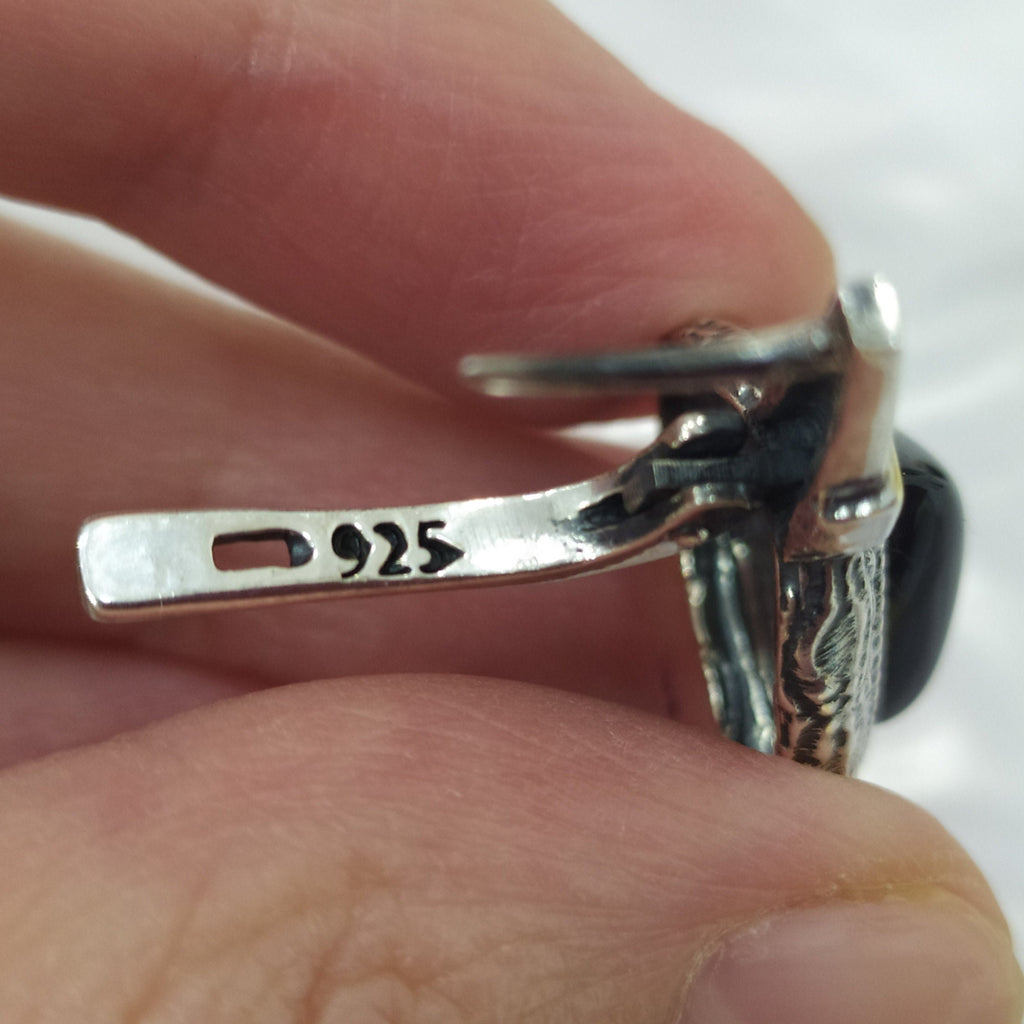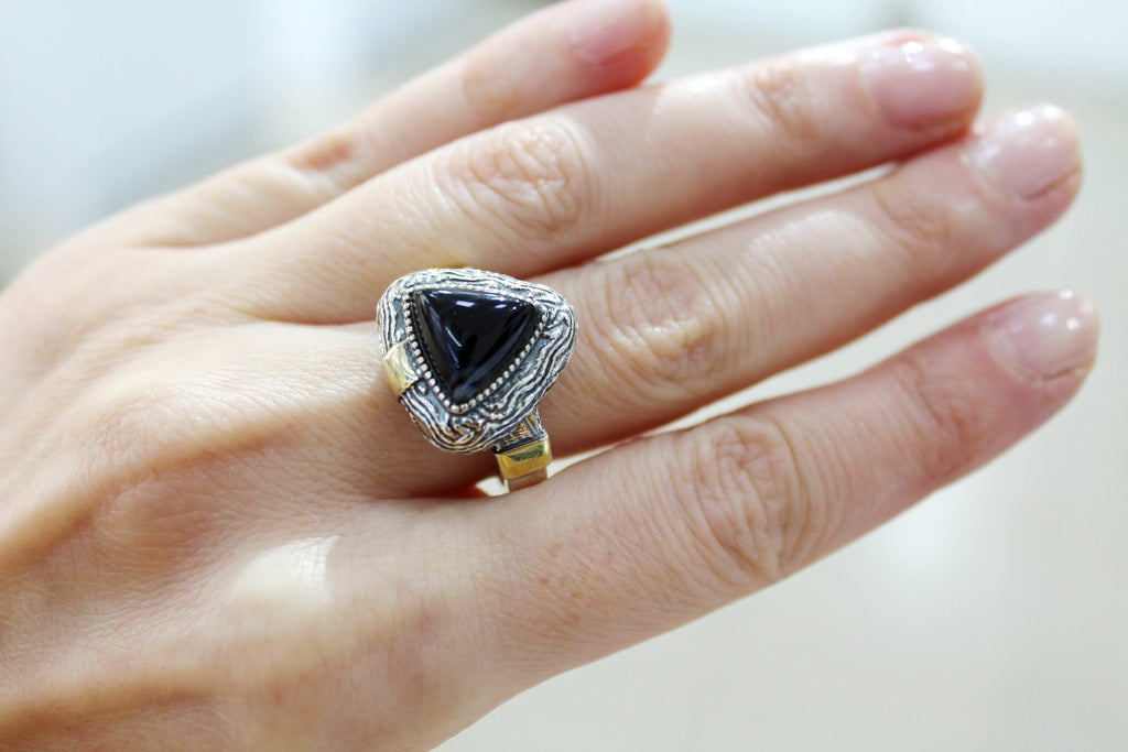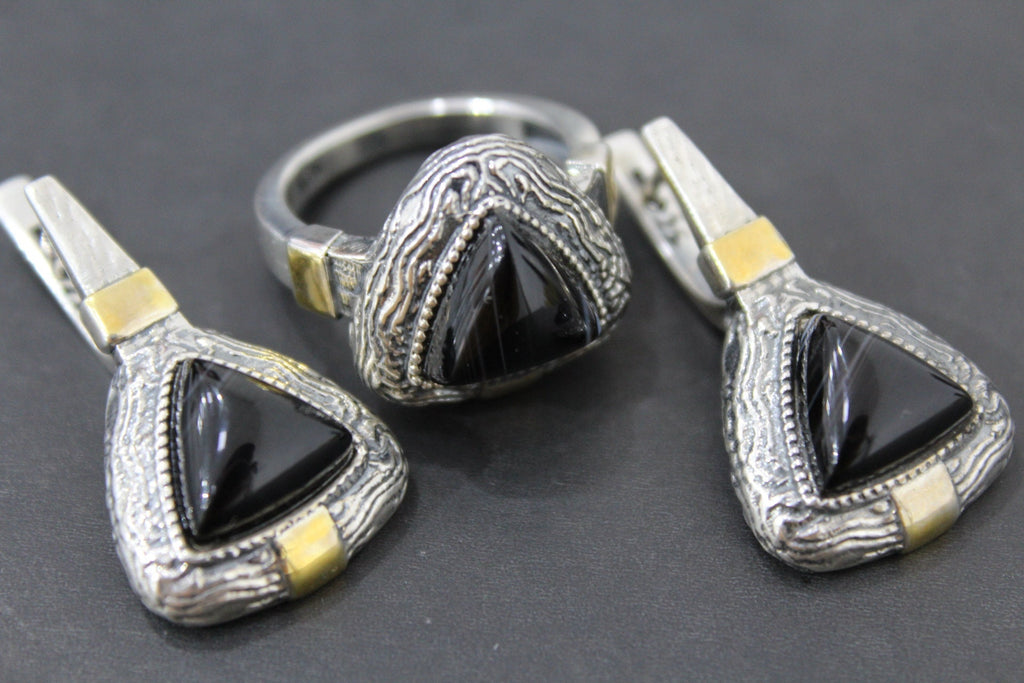 Elevate your style with our RING and Earrings Natural obsidian dark brown gemstone Set. Made with Sterling Silver 925 and gold plated parts, this classy jewelry set adds a touch of elegance to any outfit. Show off your refined taste with this exquisite set.