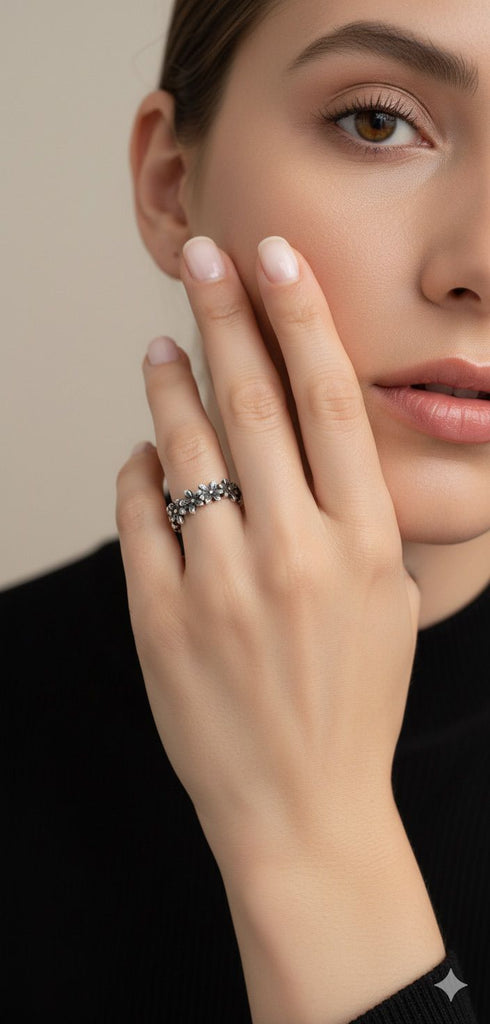 This flower band ring is handcrafted in Armenia from 925 sterling silver. The ring features a delicate row of flowers around the band. It weighs 3.0 grams and offers comfortable everyday wear. The floral design adds feminine elegance to any outfit. This romantic ring suits nature lovers and flower enthusiasts. Premium sterling silver ensures durability and lasting shine. Each ring is carefully made by skilled Armenian artisans. Perfect for spring weddings or garden parties. Great gift for women who love floral jewelry.