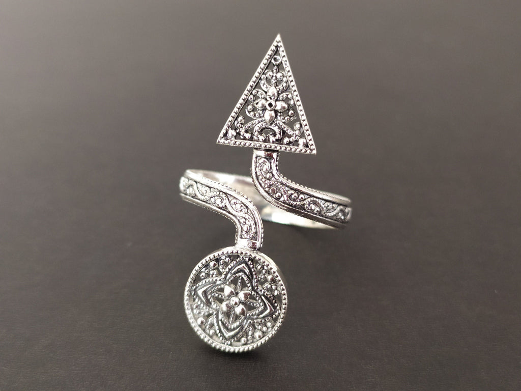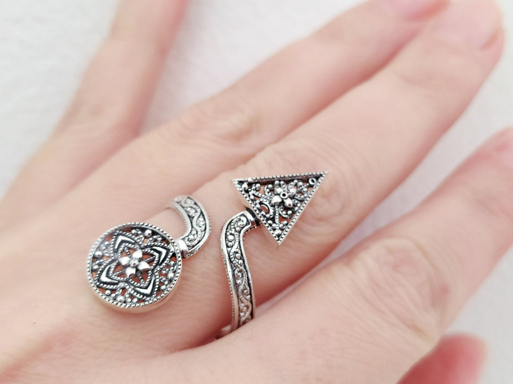 Do you like unusual and 925 sterling silver jewelry? Do you want jewelry to be at a reasonable price and not expensive? Pay attention to these precious metal rings that any woman can afford. These rings are also suitable for a gift to your beloved wife, girlfriend, mother. The ring consists of a circle and triangle in which two flowers are located. The ring can be adjusted according to your size. This silver jewelry will be a great addition for those who love boho style. The ring is also suitable for everyday wear with any clothes.