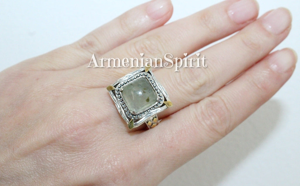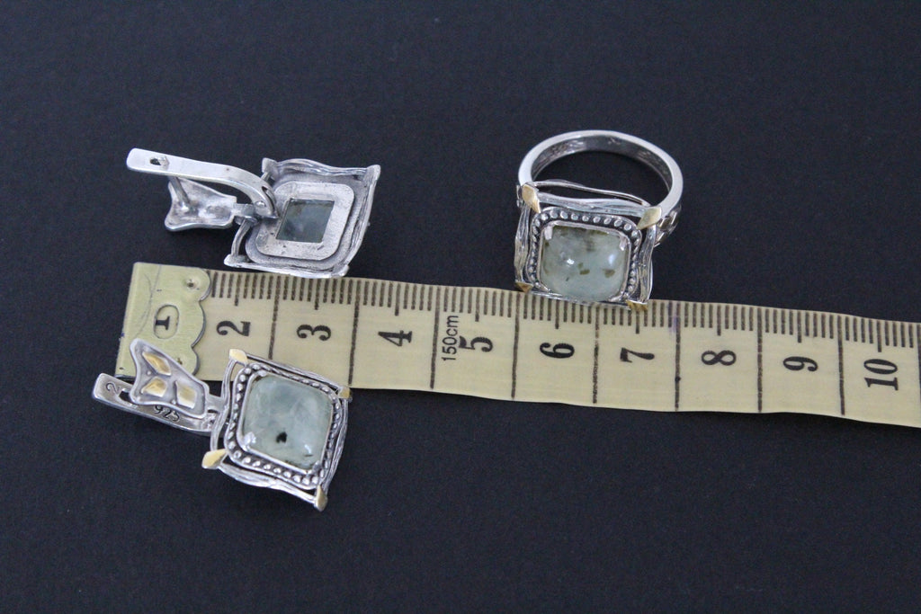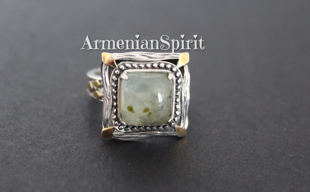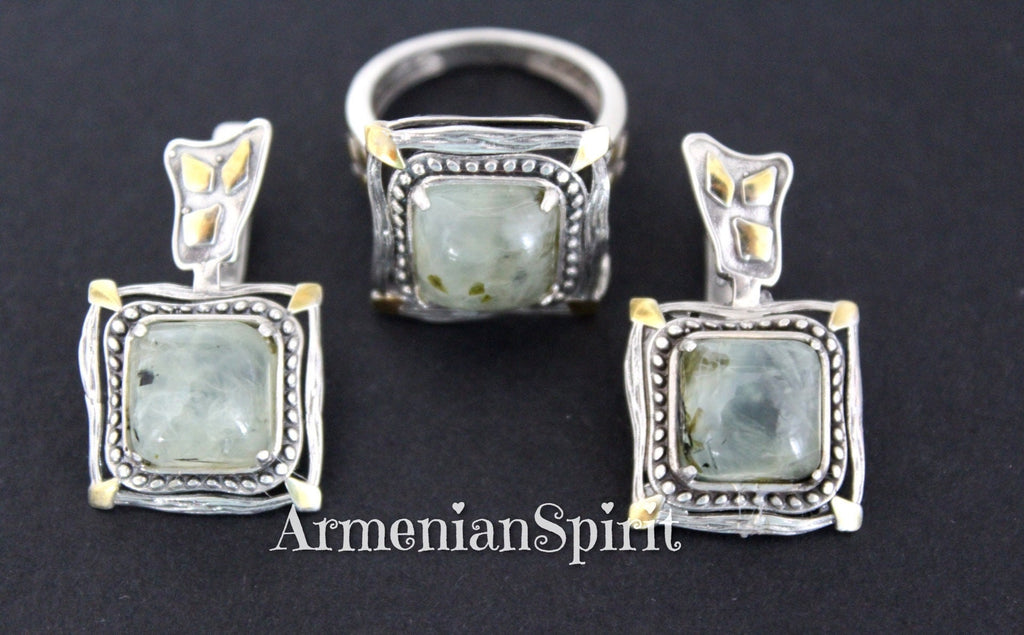Indulge in the unique beauty of Armenian Spirit's artisan jewelry. Shop the best store for gifts on Etsy and discover high quality pieces such as these stunning Green Prehnite Earrings and Ring. Handcrafted with Silver 925 and plated with gold, these beautiful square gemstones will elevate any outfit. Buy online now and treat yourself or someone special!