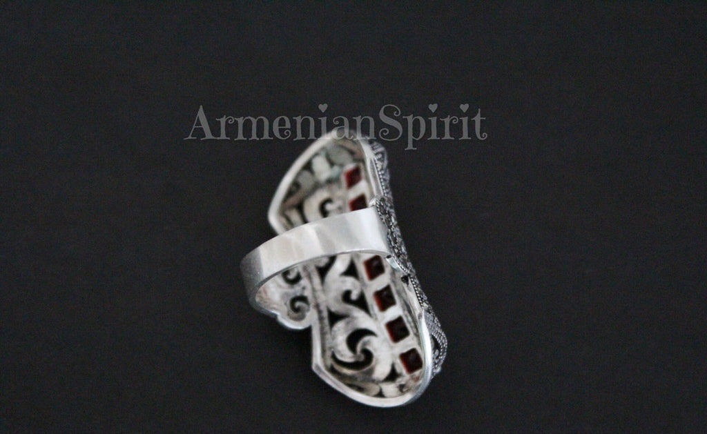 Elevate your style with our stunning large sterling silver ring featuring vibrant red lab topaz stones. Handmade by skilled Armenian artisans, this jewelry piece is perfect for women who appreciate quality and unique design. Make a statement with the best silver jewelry on Armenian Spirit. Find the best silver jewelry with marcasite stones. Enjoy free shipping and discounts on unique and high-quality pieces on Armenian Spirit jewelry store!