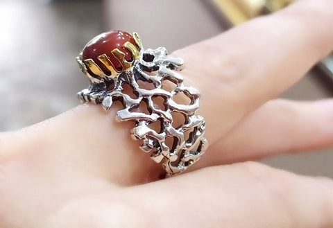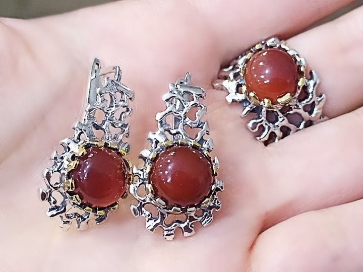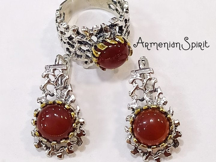 Experience the best in handmade jewelry at our Armenian Spirit store. Shop with confidence knowing you'll receive high quality pieces with free shipping and exclusive discounts. Perfect gifts for the stylish woman in your life. This genuine Armenian jewelry features a natural Carnelian stone set in 925 silver and real gold plating. The perfect gift for any woman, available at our store. Add a touch of elegance and style to any outfit with this stunning piece.