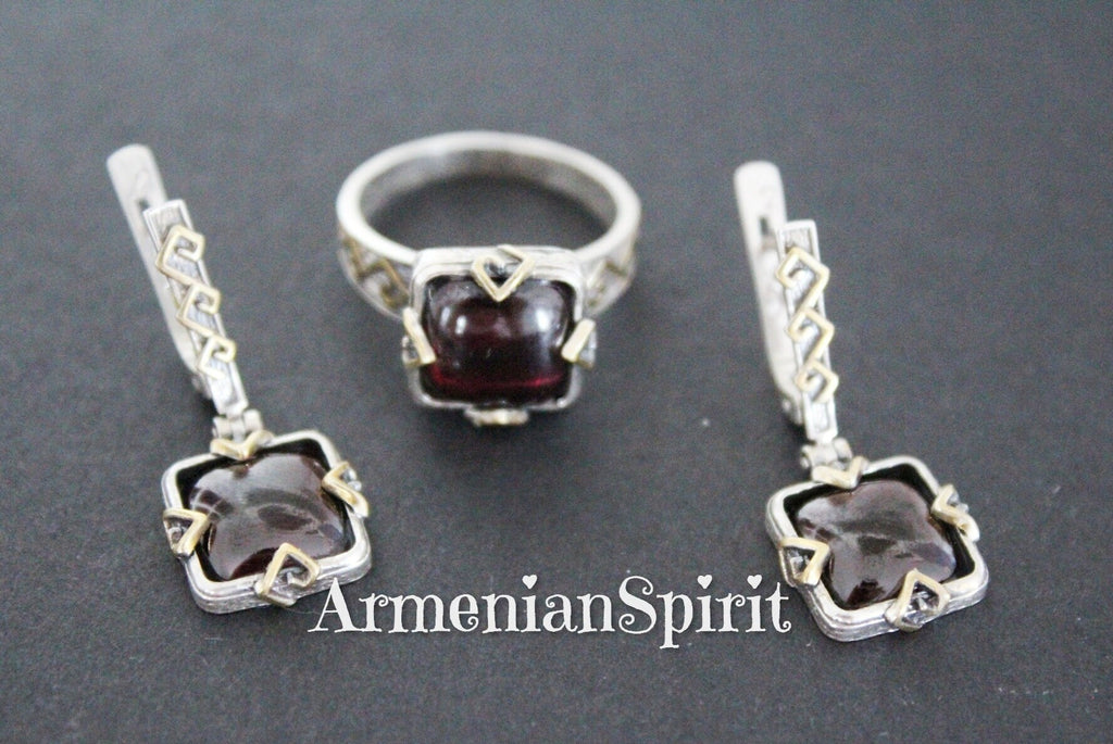 Add a touch of elegance to any outfit with our high-quality Armenian Spirit jewelry set. Made from 925 silver and featuring a natural garnet, this ring and earring set is the perfect gift for any occasion. Upgrade your jewelry collection and shop with confidence at the best store for gifts - Etsy. Shop at Armenian Spirit for the best selection of high-quality jewelry. Our stunning garnet gemstones are known to attract love, happiness, and strengthen relationships with your partner. Show your love for your partner with our high-quality garnet gemstone jewelry from Armenian Spirit. Let the power of garnet attract love and happiness into your relationship. The perfect gift for any occasion.