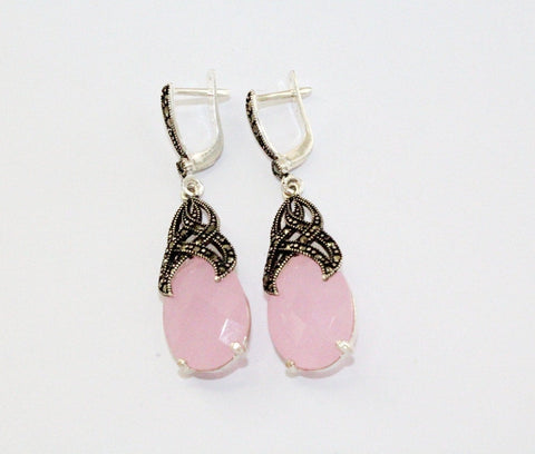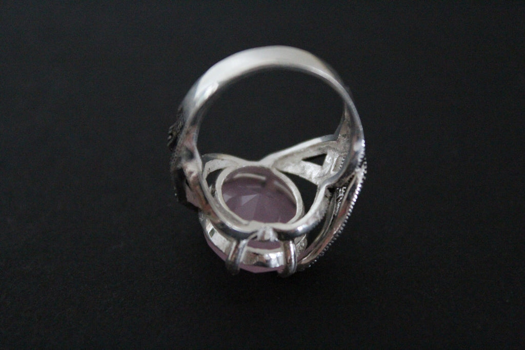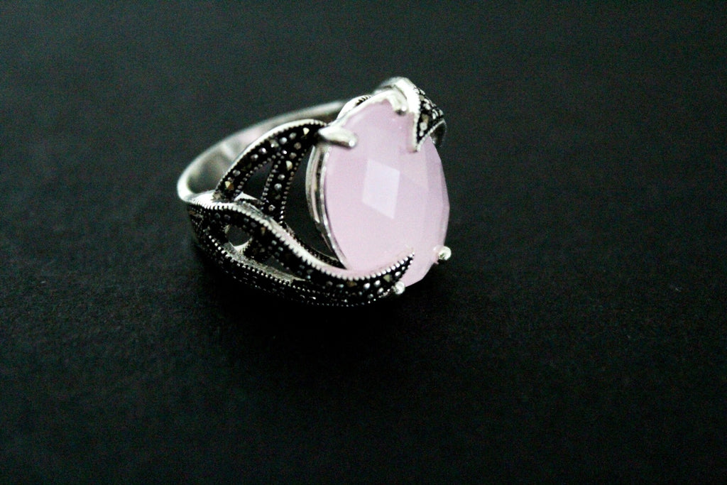This stunning silver ring features a delicate pale pink topaz stone and sparkling marcasite accents. Crafted with expert precision, this hand-crafted piece is available exclusively online. Elevate your style with this elegant and unique accessory.