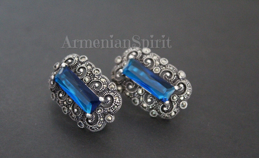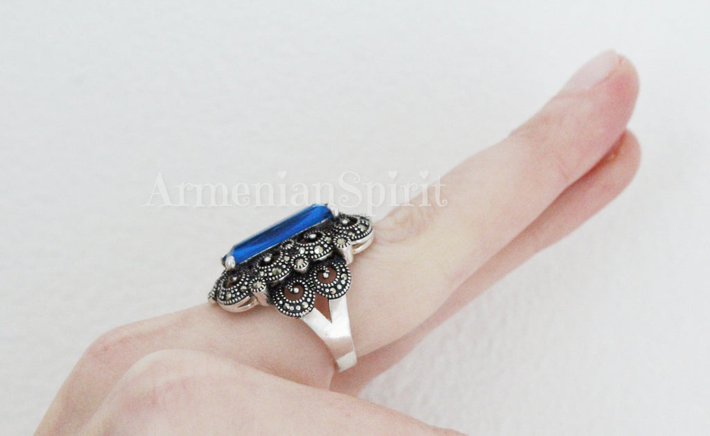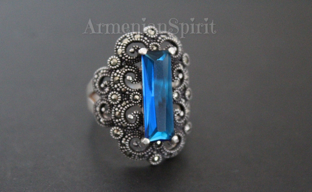 Indulge in the timeless elegance of our Armenian Spirit store. Our exquisite ring features a sterling silver 925 band adorned with vintage style Armenian jewelry. The sparkling blue topaz stone adds a touch of luxury to this small but stunning piece. Elevate your style and make a statement with this exclusive accessory.