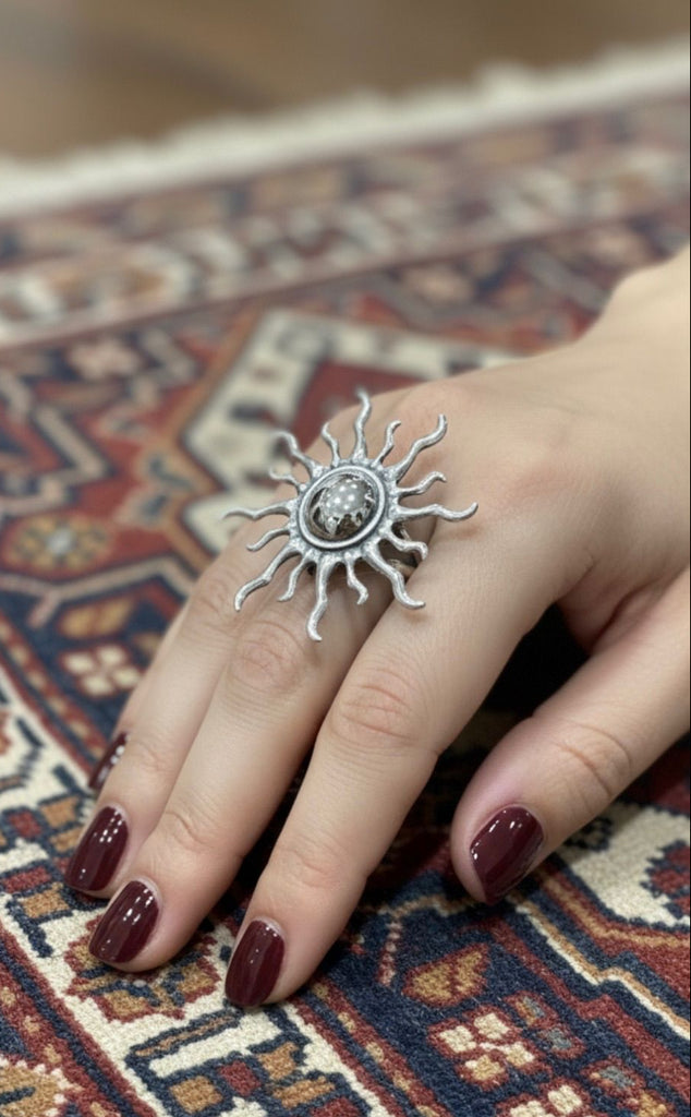 Armenian sun-shaped ring in authentic 925 sterling silver. The sun symbol represents life, energy, and divine light in Armenian culture, revered for centuries as a source of warmth, hope, and renewal. This handcrafted ring connects you to ancient traditions while making a bold modern statement. Completely handmade by skilled Armenian artisans using traditional silversmithing techniques. Weighing 9 grams, this substantial piece showcases detailed rays and superior craftsmanship that makes Armenian jewelry treasured worldwide. Perfect gift for sun lovers, celestial jewelry enthusiasts, or anyone who appreciates meaningful cultural pieces. Ideal for everyday wear or special occasions. Timeless design suits bohemian, ethnic, or modern styles. Free worldwide shipping from Armenia with tracking.