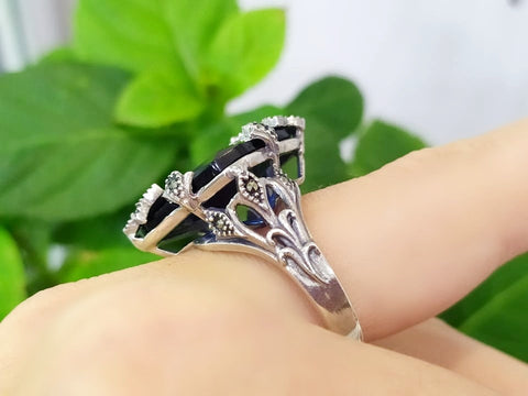 Add a touch of luxury to any outfit with our royal blue ring from our Armenian jewelry collection. Made of sterling silver 925 and adorned with rich marcasite, this evening cocktail ring is perfect for weddings or special occasions. Elevate your style with this stunning and intricately crafted piece. WE MAKE THIS SET IN ANY COLOR (stone): RED, BLUE, BLACK, BROWN, GREEN, PINK, etc.