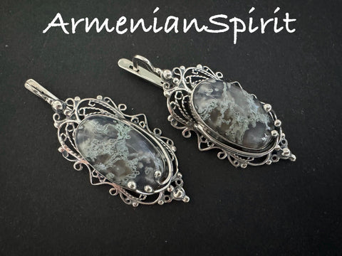 Experience the unique beauty of these one-of-a-kind green moss agate earrings crafted by expert artisans. Made of high quality sterling silver 925, these filigree earrings from Armenian Spirit jewelry store are the perfect addition to your collection. Each pair is individually handcrafted with filigree detailing, making them one of a kind jewelry for a real queen. Purchase online for a truly special and timeless piece of jewelry. Buy online jewelry on SALE with Free shipping Worldwide!