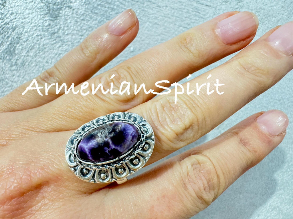 Explore the beauty and uniqueness of this one of a kind vintage inspired ring, featuring a natural charoite purple gemstone with natural cracks. Made with 925 sterling silver, this ring is a timeless treasure that adds elegance to any purple outfit. The perfect addition to your one of a kind jewelry collection. This sterling silver 925 Armenian handmade jewelry offers exquisite craftsmanship and interesting designs. Enjoy the convenience of free worldwide shipping and the security of payments with Paypal, Mastercard, or Visa card.