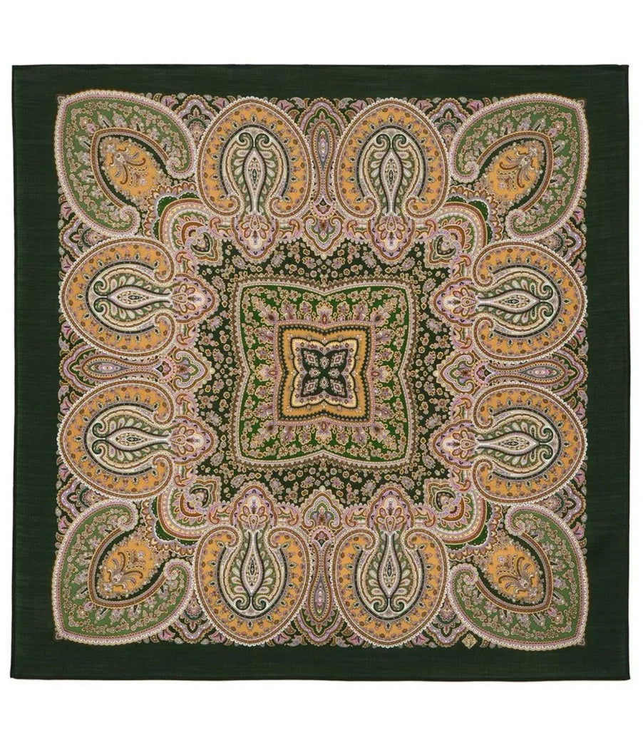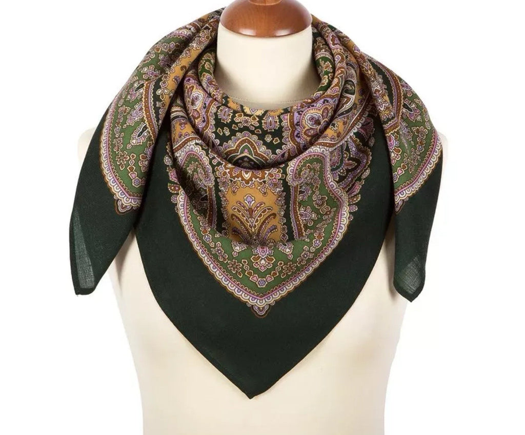This Pavlovo Posad scarf is made of high-quality Merino wool, featuring a beautiful Eastern Motive design in dark green, light green, and mustard colors. The scarf measures 35 inches and can be styled in various ways such as a wrap, head scarf, neck warmer, or stole, making it a versatile accessory for all seasons. The scarf is adorned with intricate Eastern Ornament accents, adding a touch of elegance to any outfit with its Bohemian flair.