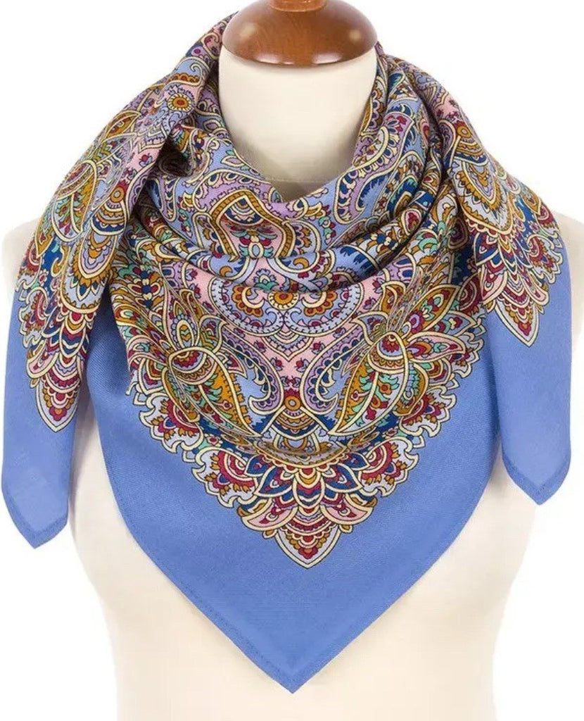 This light blue shawl is a beautiful accessory made from 100% merino wool, featuring a floral pattern in shades of orange and dark blue. The square size of 35'' makes it versatile for wearing as a wrap, headscarf, neck warmer, or stole. With a Bohemian nature theme, this Russian Pavlovo Posad shawl is perfect for all seasons - winter, spring, summer, and fall. Made in the Russian Federation, this sky blue Russian scarf is a stylish and functional addition to any woman's wardrobe.