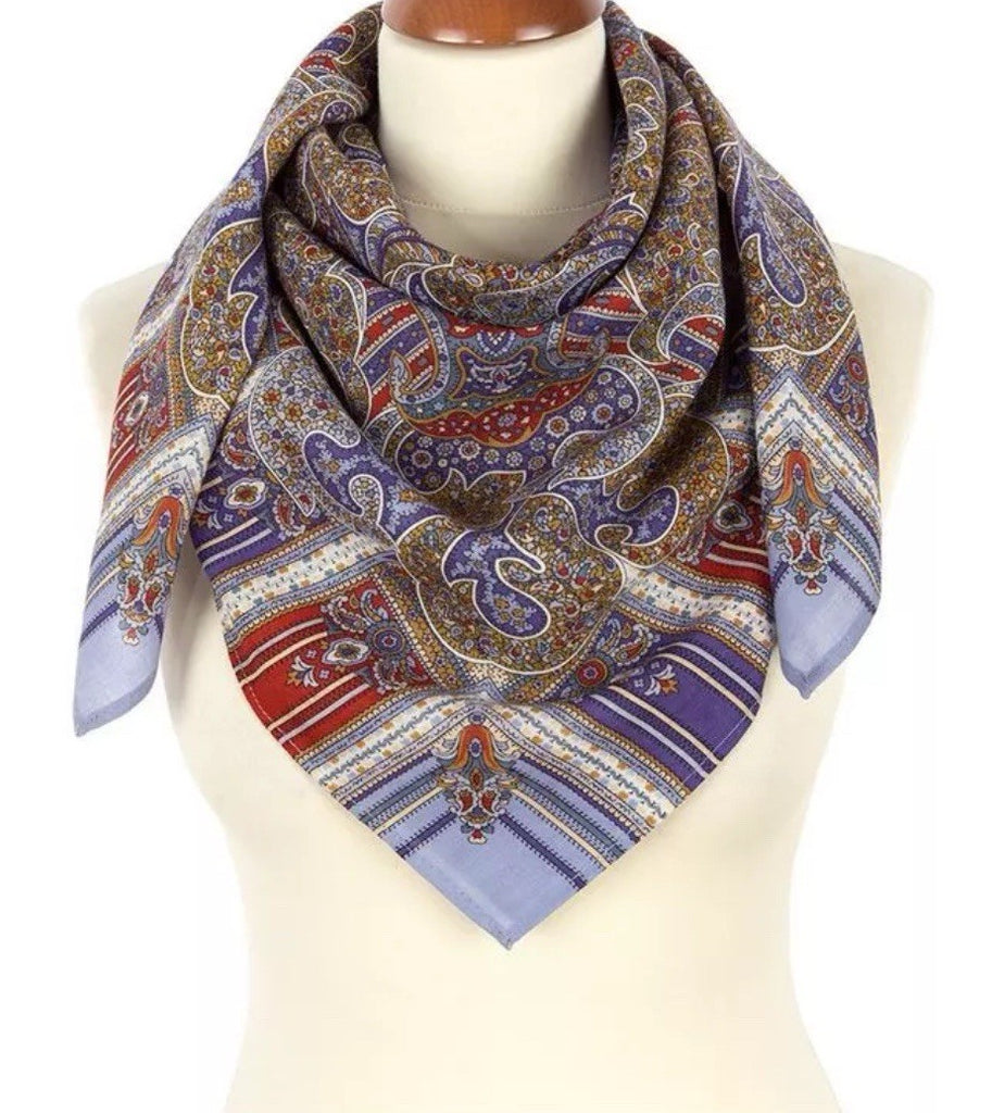 This scarf is a 35'' square shawl made of 100% merino wool, featuring a traditional Russian Pavlovo Posad design in a mix of purple, red, light blue, brown, and white colors. It is an ethnic-inspired piece with a nature and bohemian theme, perfect for wrapping, head wear, or neck warming. The high-quality woolen fabric and intricate pattern make it a versatile and stylish accessory for all seasons. Dry clean only to maintain its beauty.