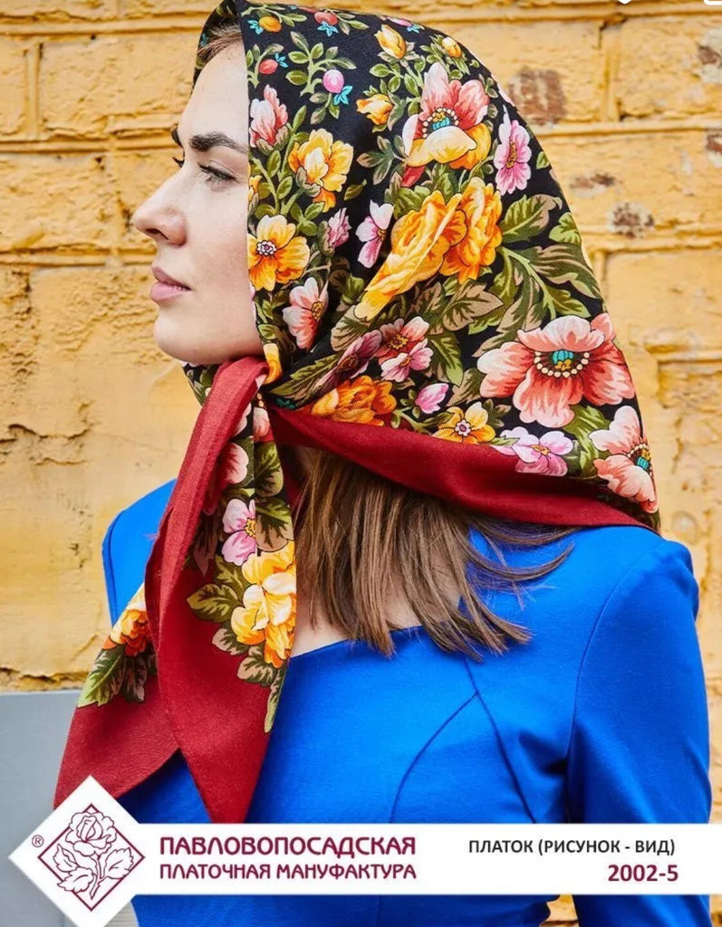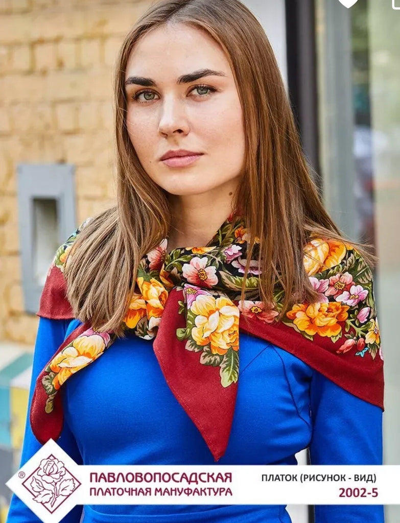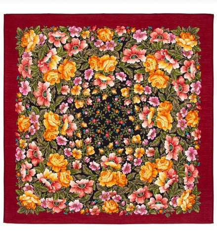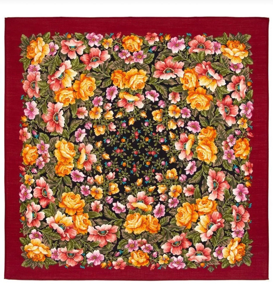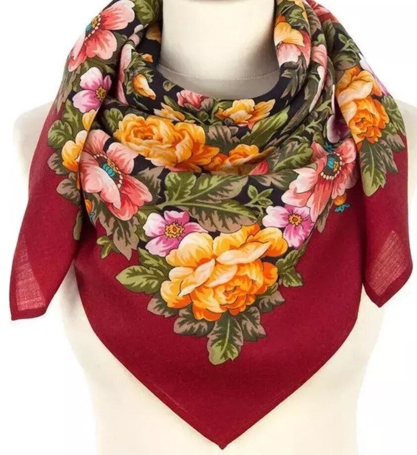 This 35'' square scarf is made of 100% natural merino wool from Pavlovo Posad, Russia. The scarf features a floral pattern in shades of burgundy, black, yellow, and green, depicting leaves and flowers. It is designed for women and can be styled in multiple ways such as a wrap, head scarf, or neck warmer. This versatile scarf is suitable for all seasons, including winter, summer, fall, and spring, and should be dry cleaned only to maintain its quality.