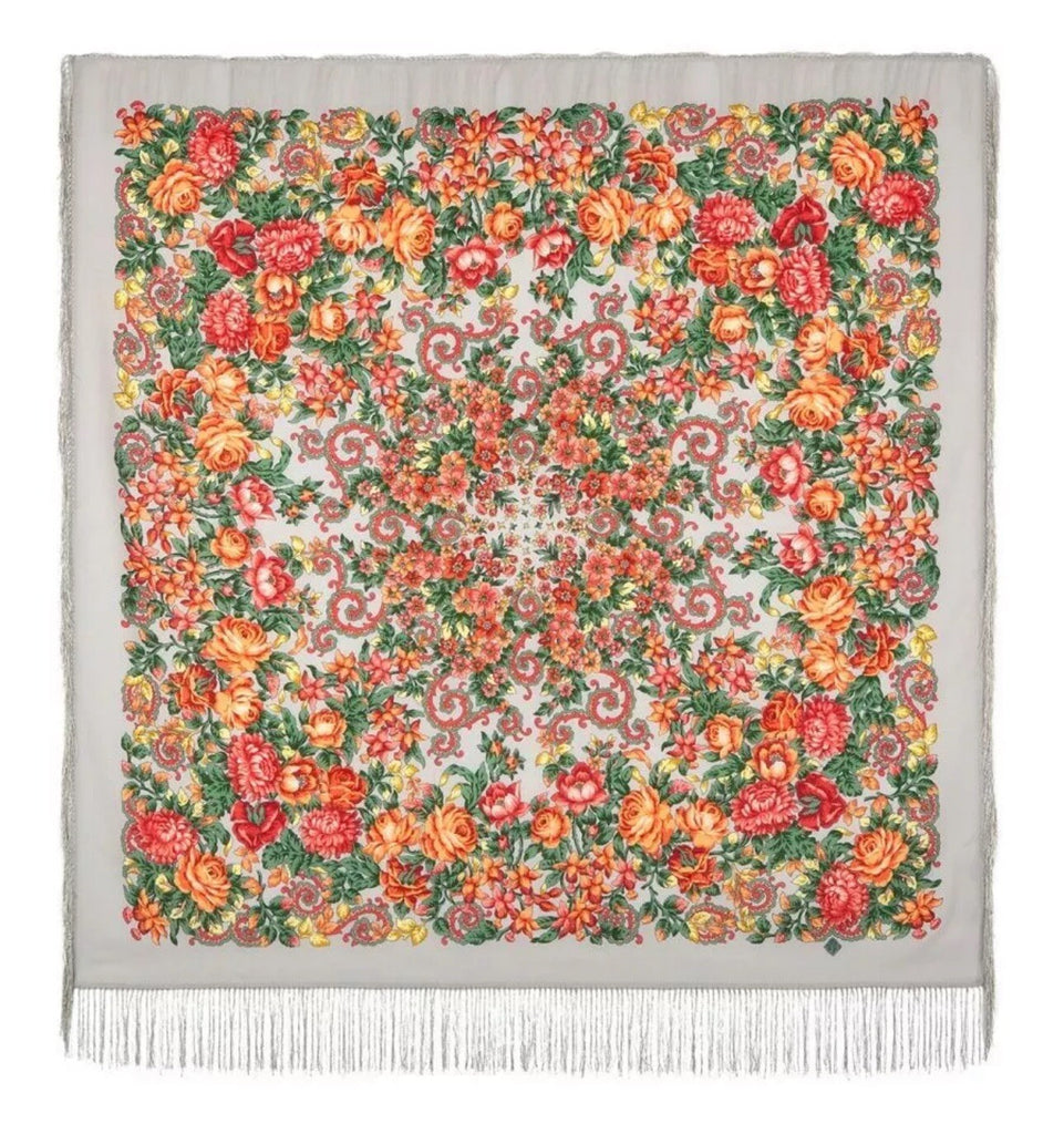 motifs, this 49-inch square scarf features vivid orange and red peony flowers