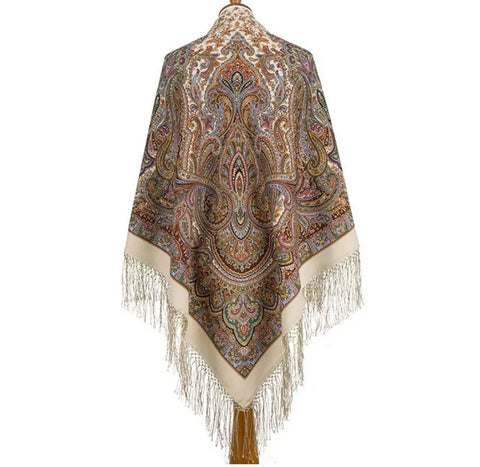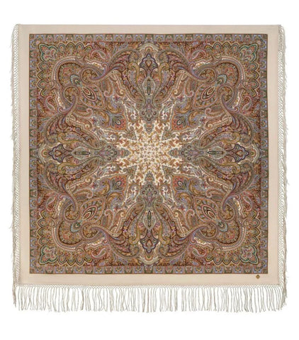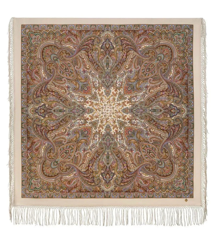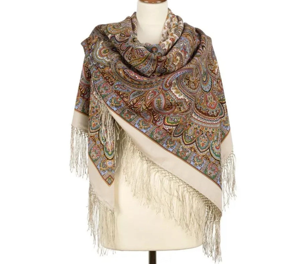 This Pavlovo Posad scarf features a traditional "Terem raspisnoi 1810-2" pattern in beige, green, light blue, orange, and turquoise colors. Made from 100% Merino wool, the square stole is adorned with leaves and flowers, and comes with fringe accents. This versatile accessory can be styled as a shawl, neck warmer, dupatta, or hijab, making it perfect for adding a touch of Slavic-inspired elegance to any outfit during all seasons.