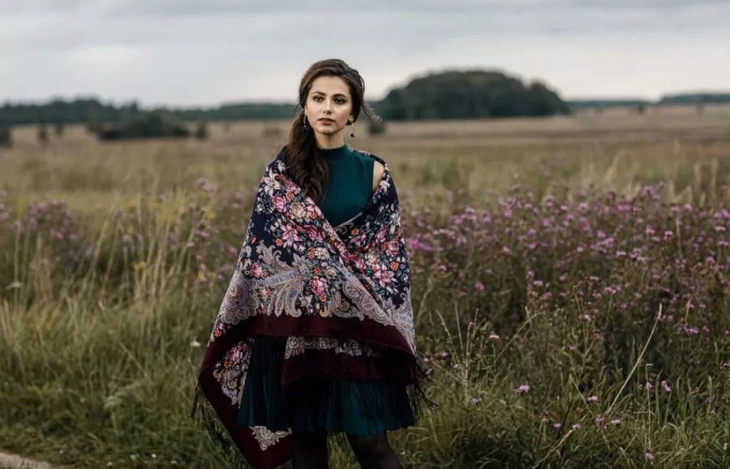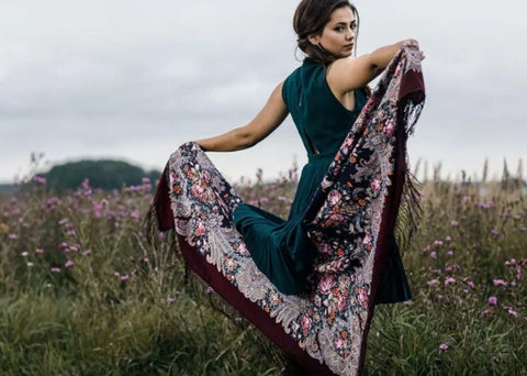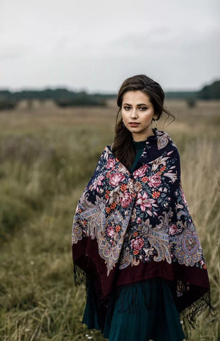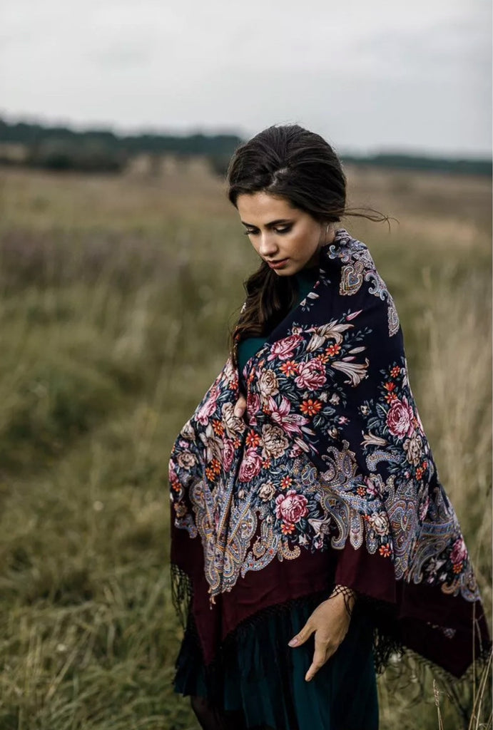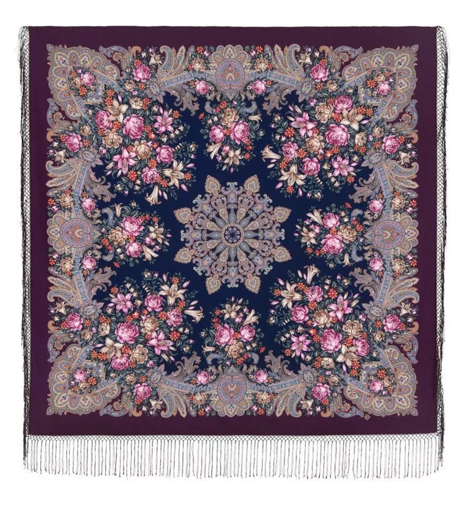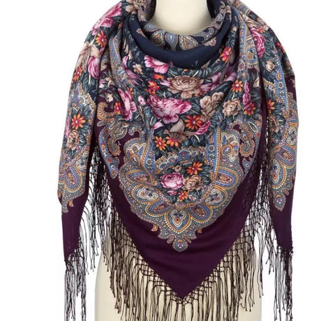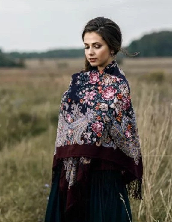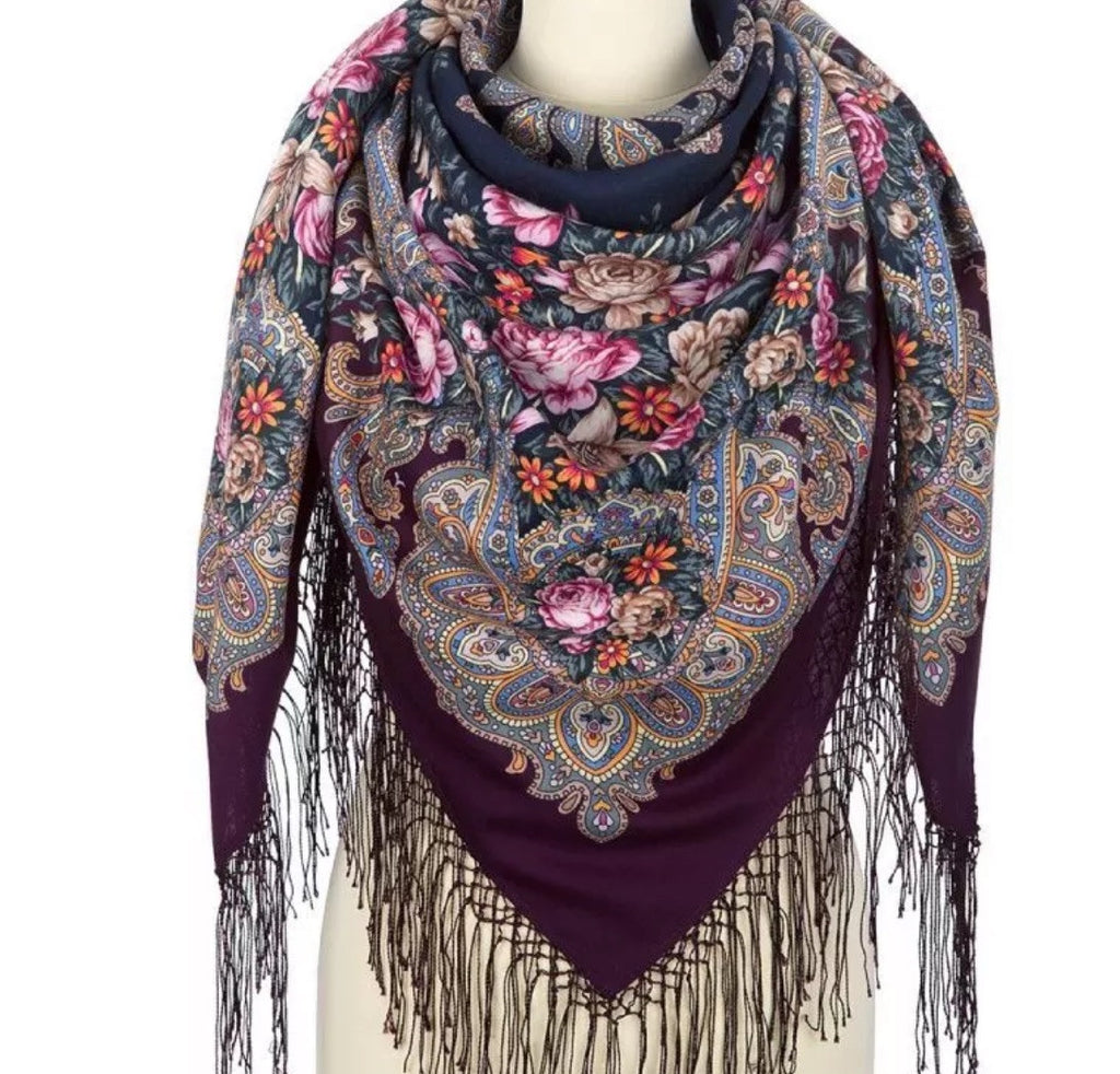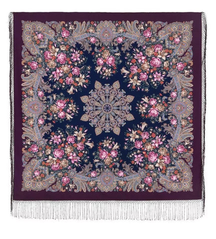 This 53'' square scarf from Pavlovo Posad is made of 100% merino wool and features a beautiful floral rose pattern in shades of purple, burgundy, beige, pink, and light blue. The scarf can be worn as a shawl, neck warmer, dupatta, or hijab, making it a versatile accessory for any season. The design, inspired by nature, includes leaves and flowers, adding a touch of elegance to any outfit. This merino wool scarf is the perfect gift for special occasions such as Mother's Day, birthdays, or anniversaries. Made from high-quality materials, it offers both warmth and style. Treat your loved ones to this luxurious and thoughtful present.